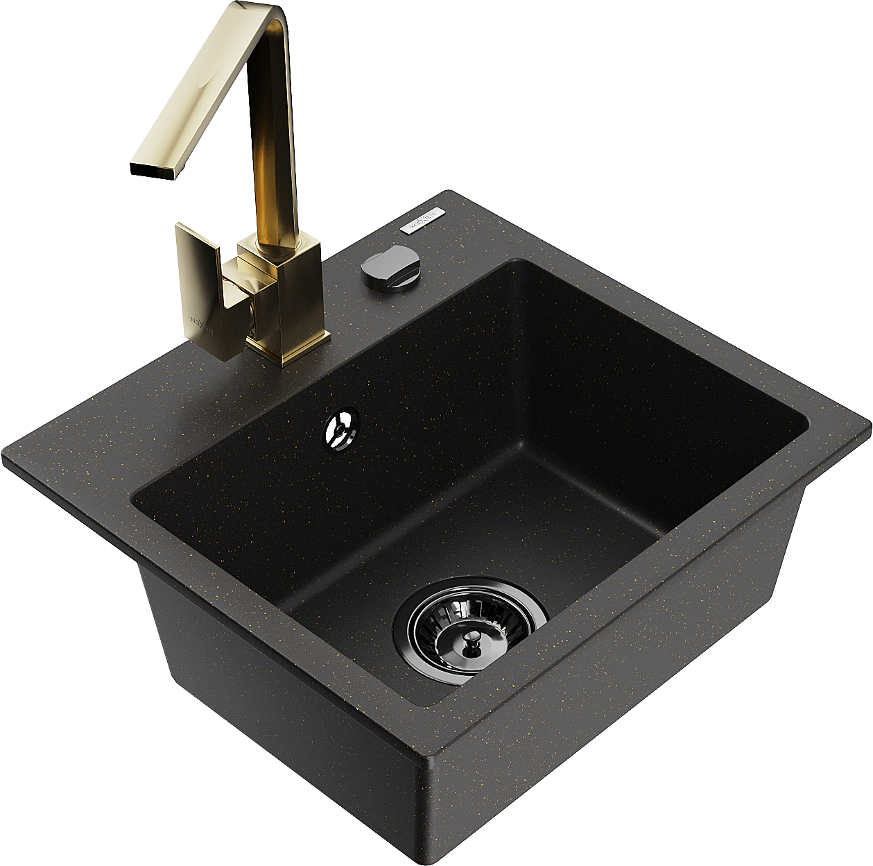 Mexen Milo granieten spoelbak 1-komorig met keukenmengkraan Rita, zwart/goud metallic - 6505-75-670300-50-B