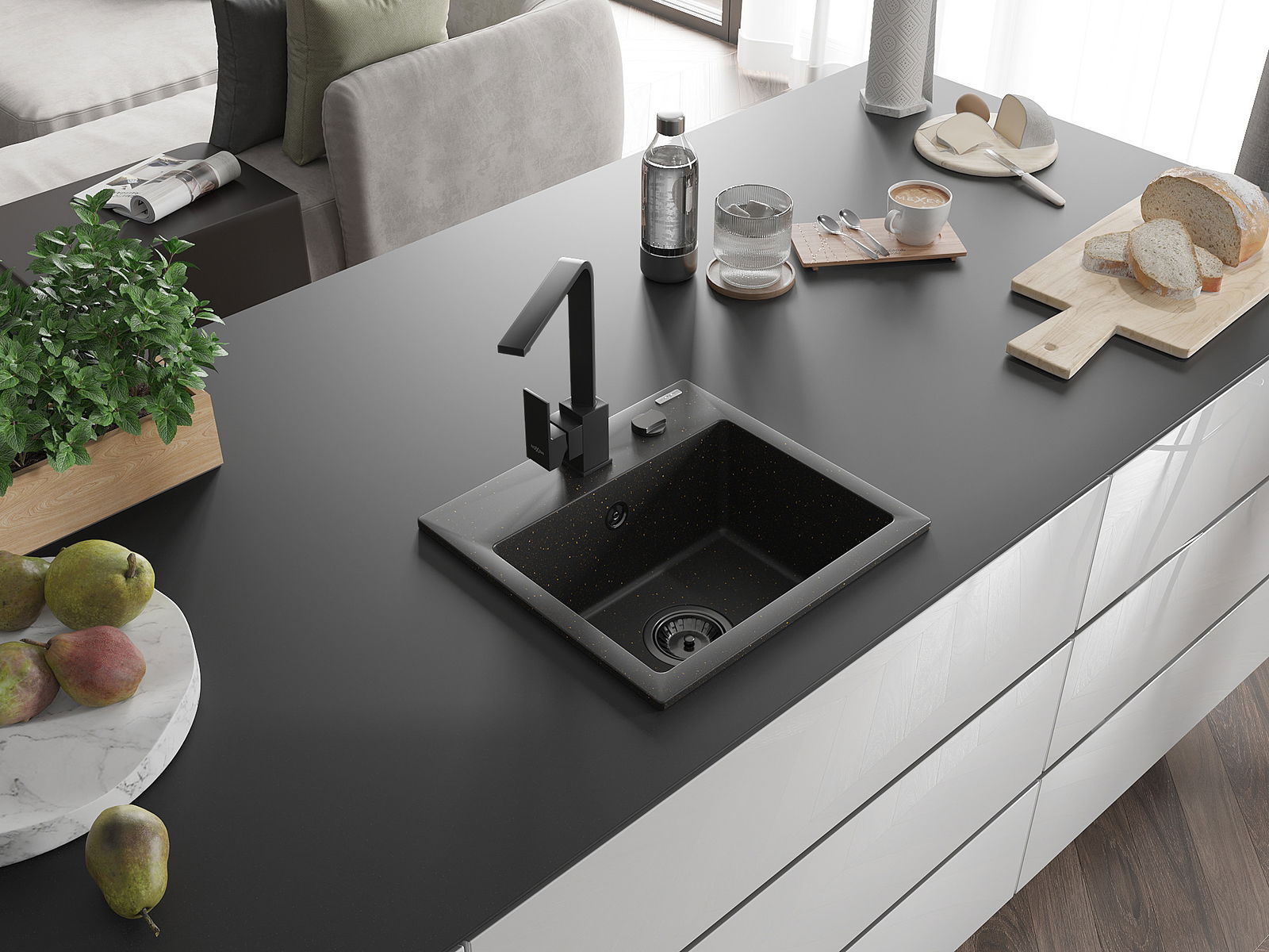 Mexen Milo granieten gootsteen 1-kompartment met keukenkraan Rita, zwart/goud metallic - 6505-75-670300-70-B
