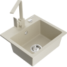 Het oppervlak van de gootsteen is bestand tegen vlekken en verkleuringen, waardoor het gemakkelijk schoon te houden is en zijn kleur behoudt gedurende een lange gebruiksperiode. Een esthetische en praktische aanvulling op elke keuken.