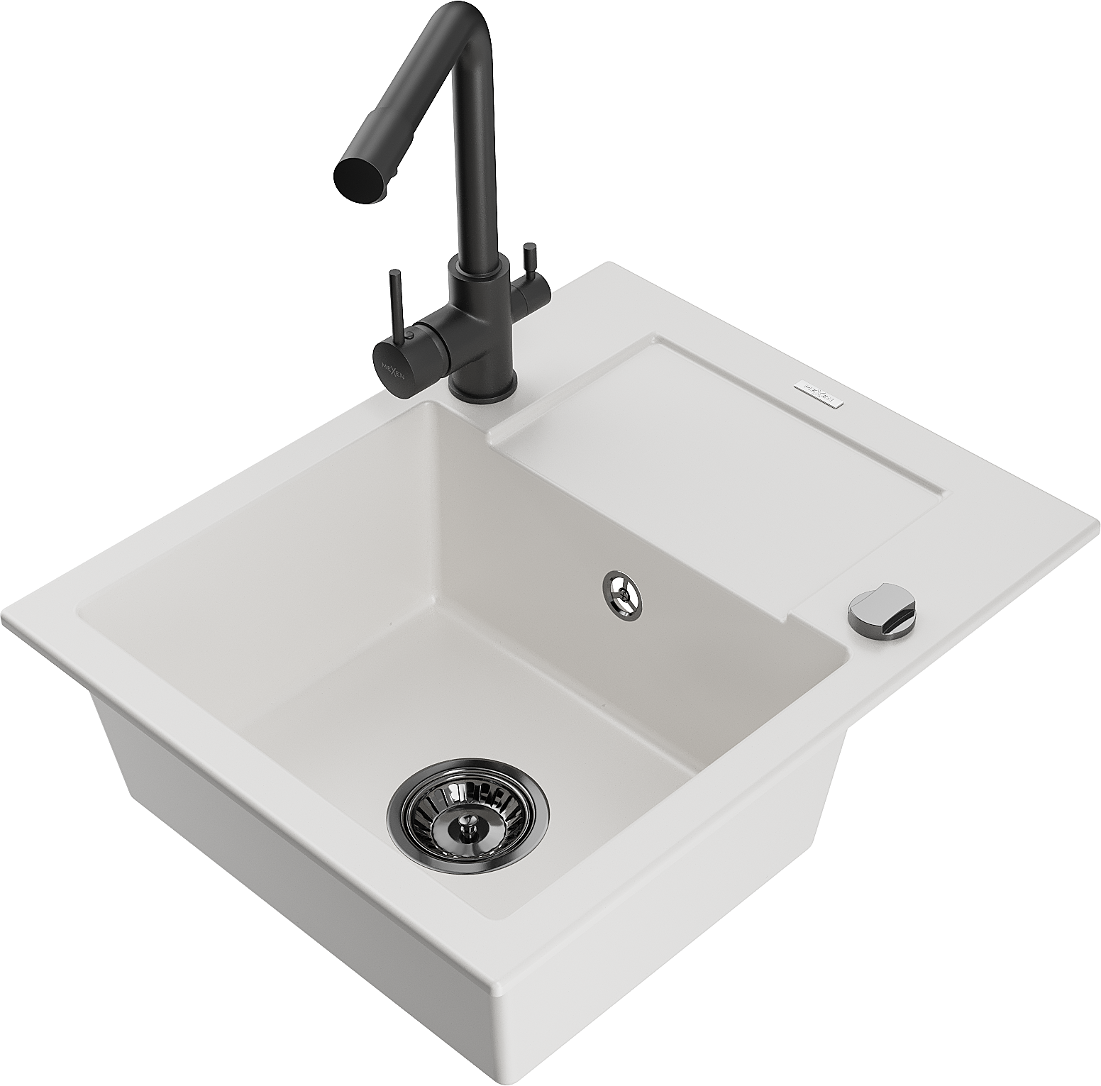 Mexen Enzo granieten gootsteen met 1 bak en afdruiprek met keukenmengkraan Duero, wit - 6506-20-671600-70