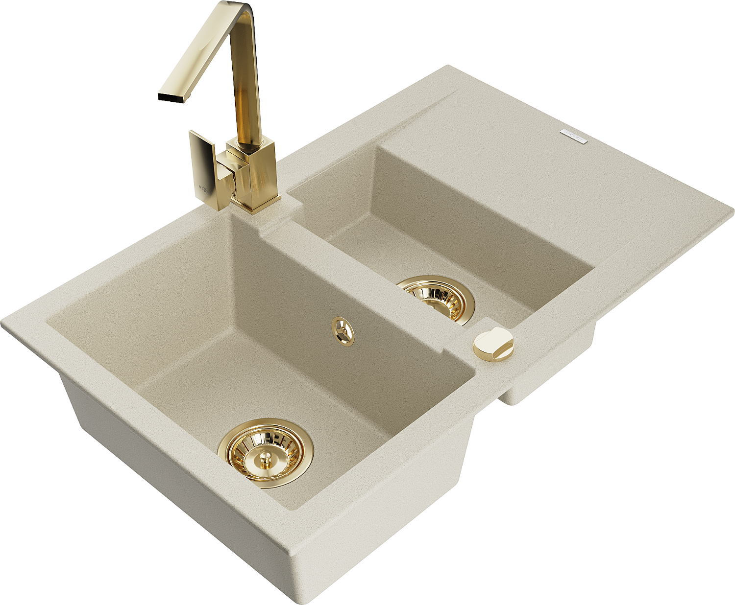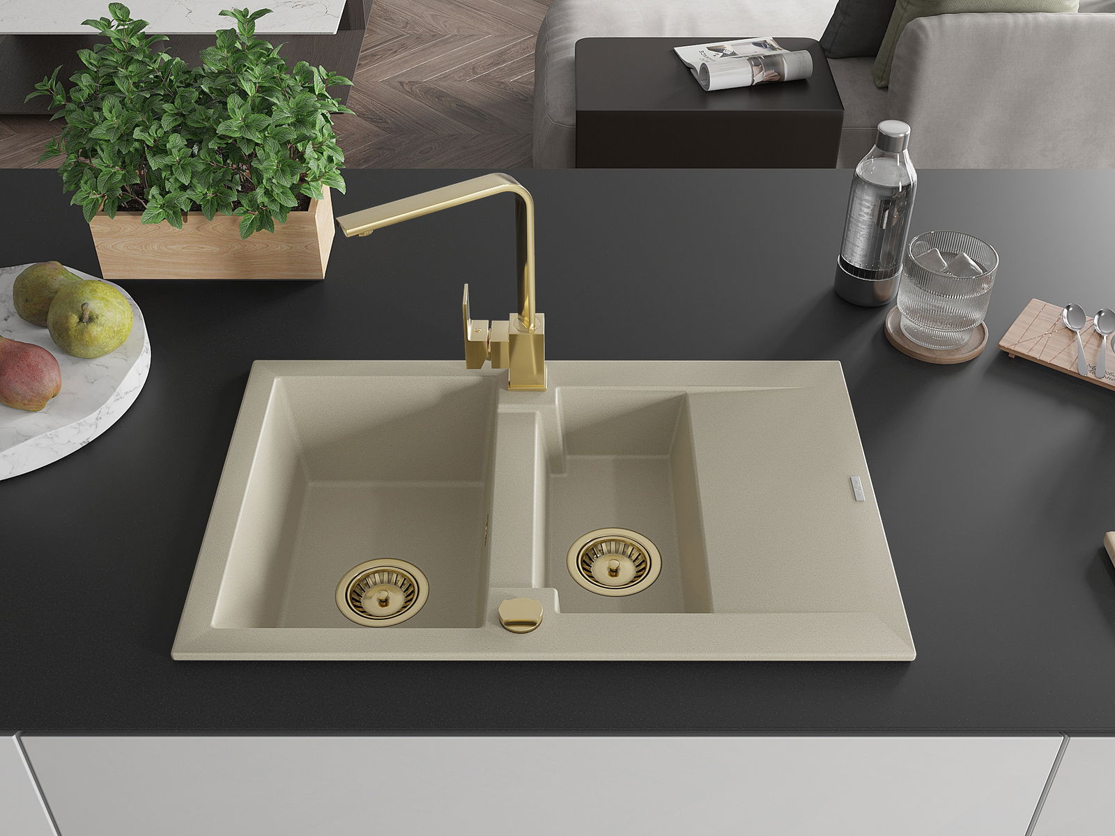 Mexen Gaspar granieten spoelbak 1,5-komorig met afdruiprek en keukenmengkraan Rita, beige - 6507-69-670300-50