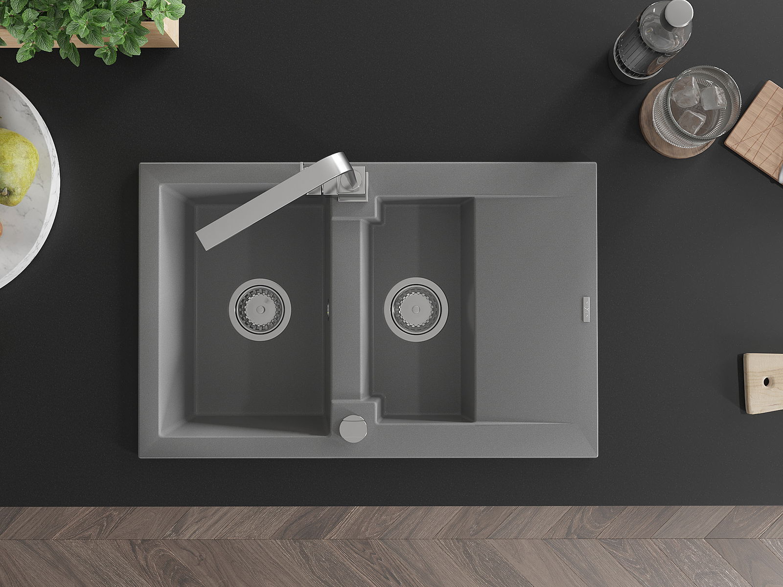 Mexen Gaspar granieten gootsteen 1,5-komer met afdruipplaat en Rita keukenkraan, grijs - 6507-71-670300-00