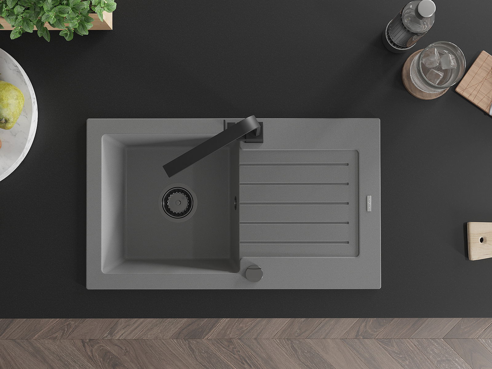 Mexen Pablo granieten gootsteen 1-komerig met afdruiprek en keukenmengkraan Rita, grijs - 6510-71-670300-70-B