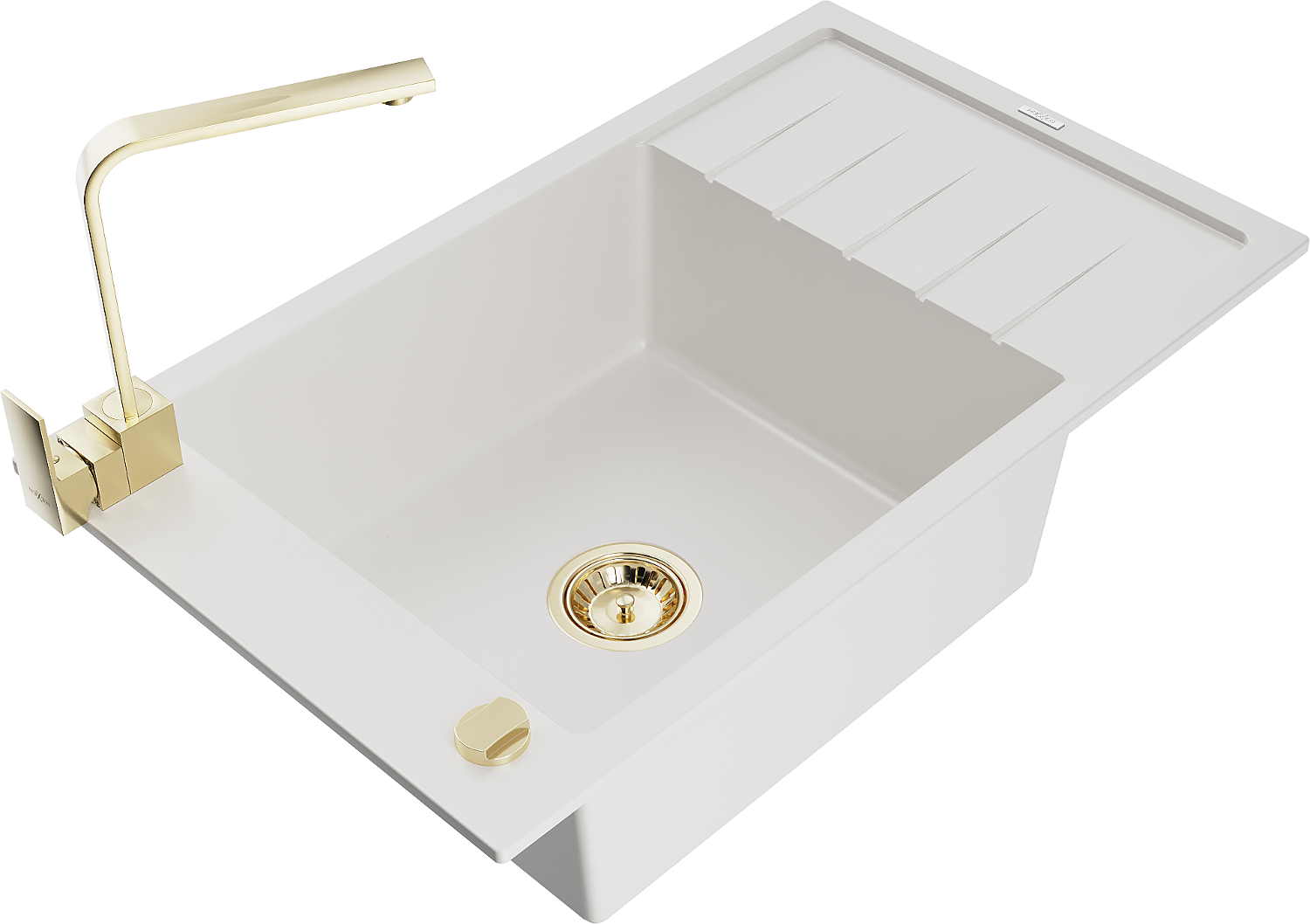 Mexen Elias granieten gootsteen 1-compartiment met afdruiprek en keukenmengkraan Rita, wit - 6511-20-670300-50