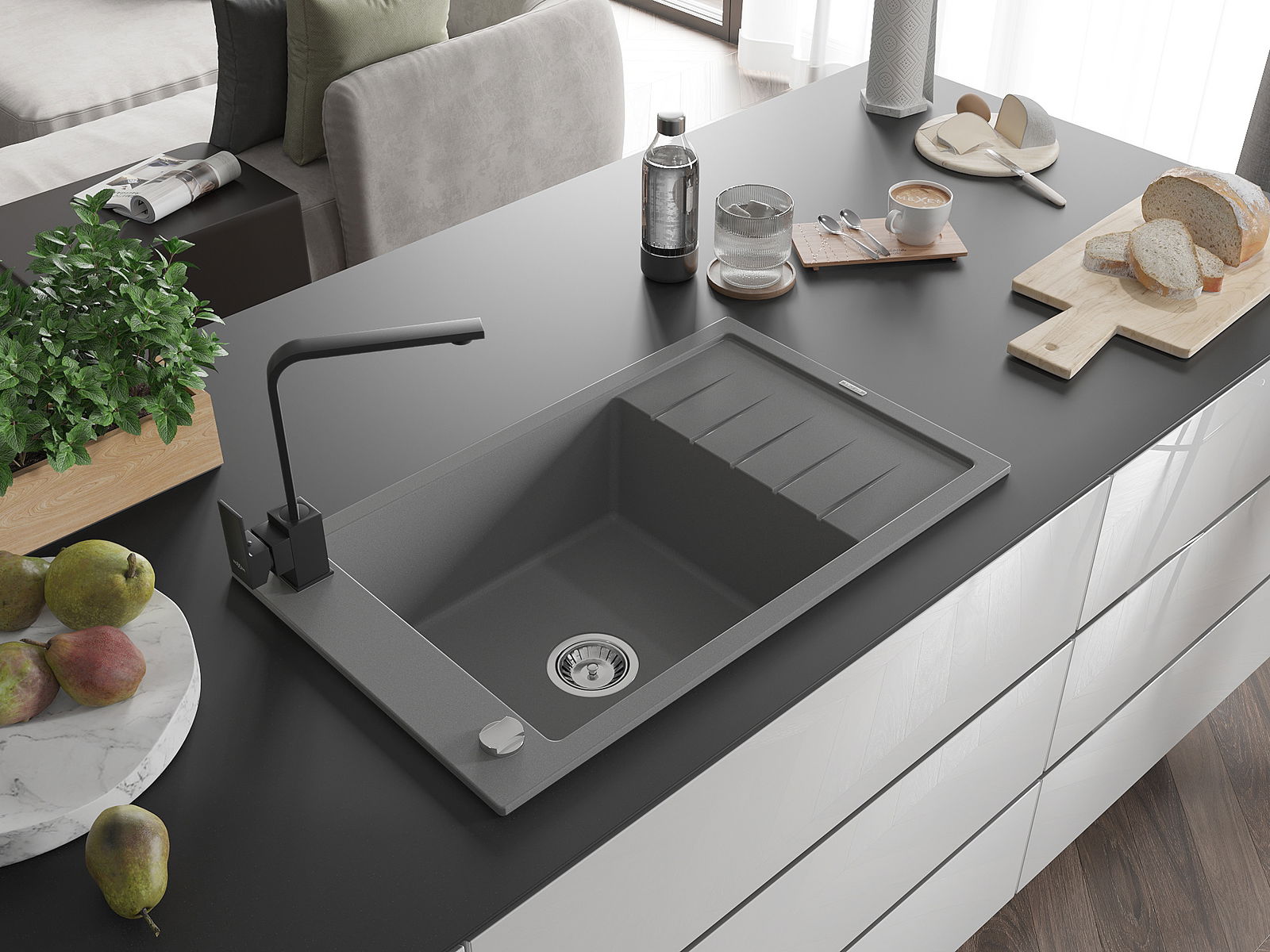 Mexen Elias granieten spoelbak 1-komorige met afdruiprek en keukenkraan Rita, grijs - 6511-71-670300-70