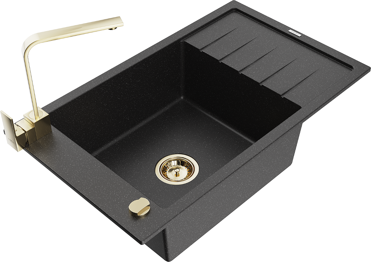 Mexen Elias granieten gootsteen met 1 bak en afdruiprek en keukenmengkraan Rita, zwart/zilver metallic - 6511-73-670300-50