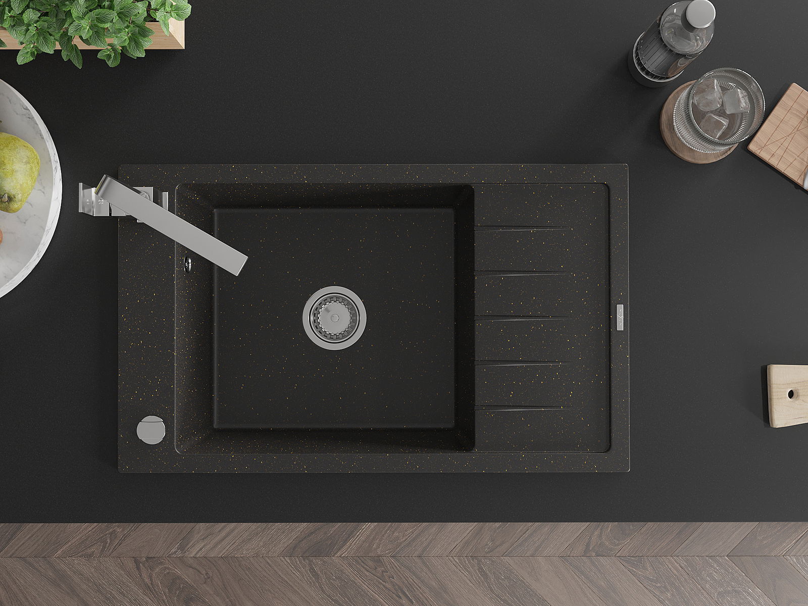 Mexen Elias granieten spoelbak 1-komerig met afdruiprek en keukenmengkraan Rita, zwart/zilveren metallic - 6511-73-670300-70