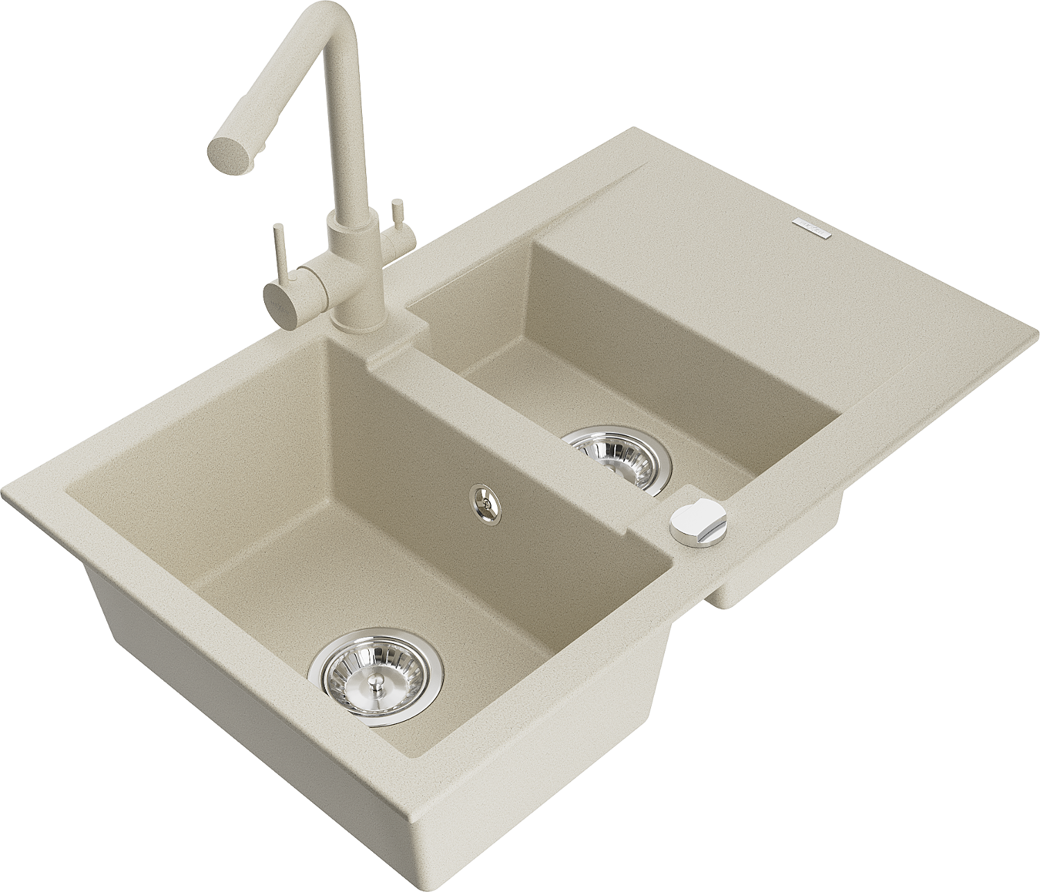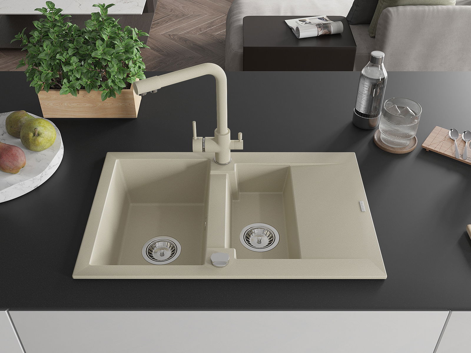 Mexen Gaspar granieten spoelbak 1,5-compartiment met afdruipplaat en keukenmengkraan Duero, beige - 6507-69-671600-69