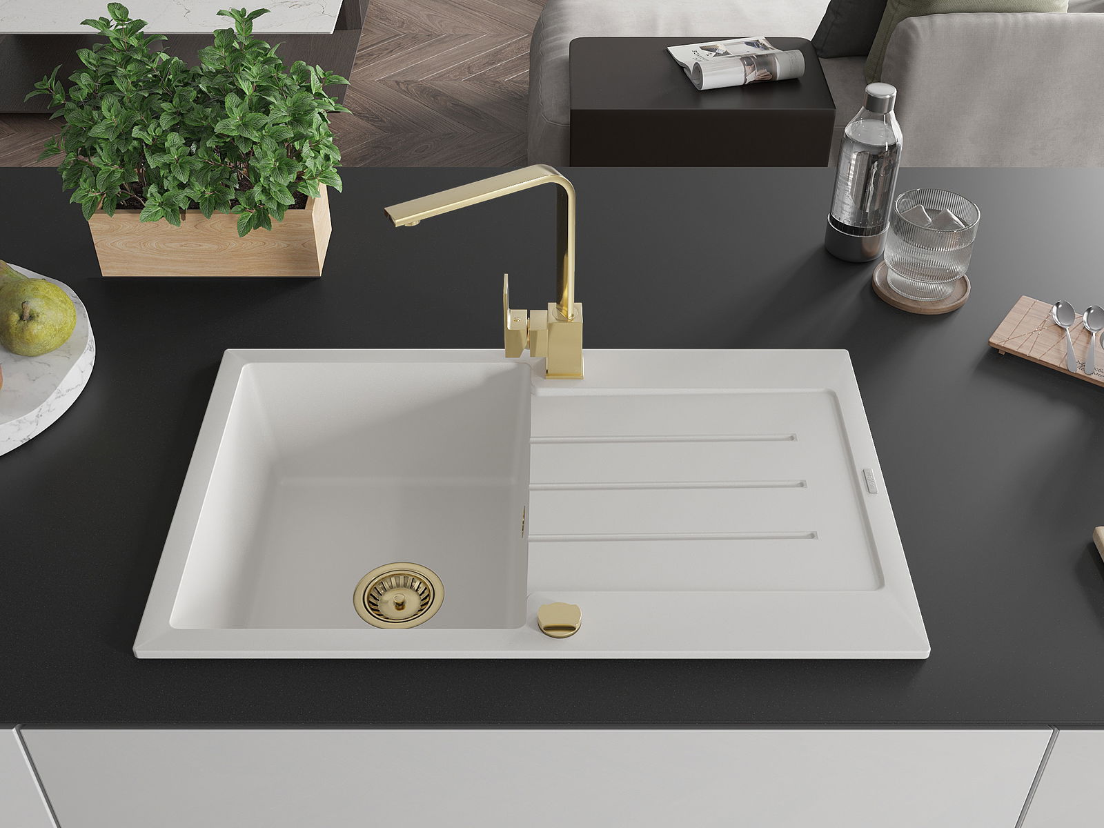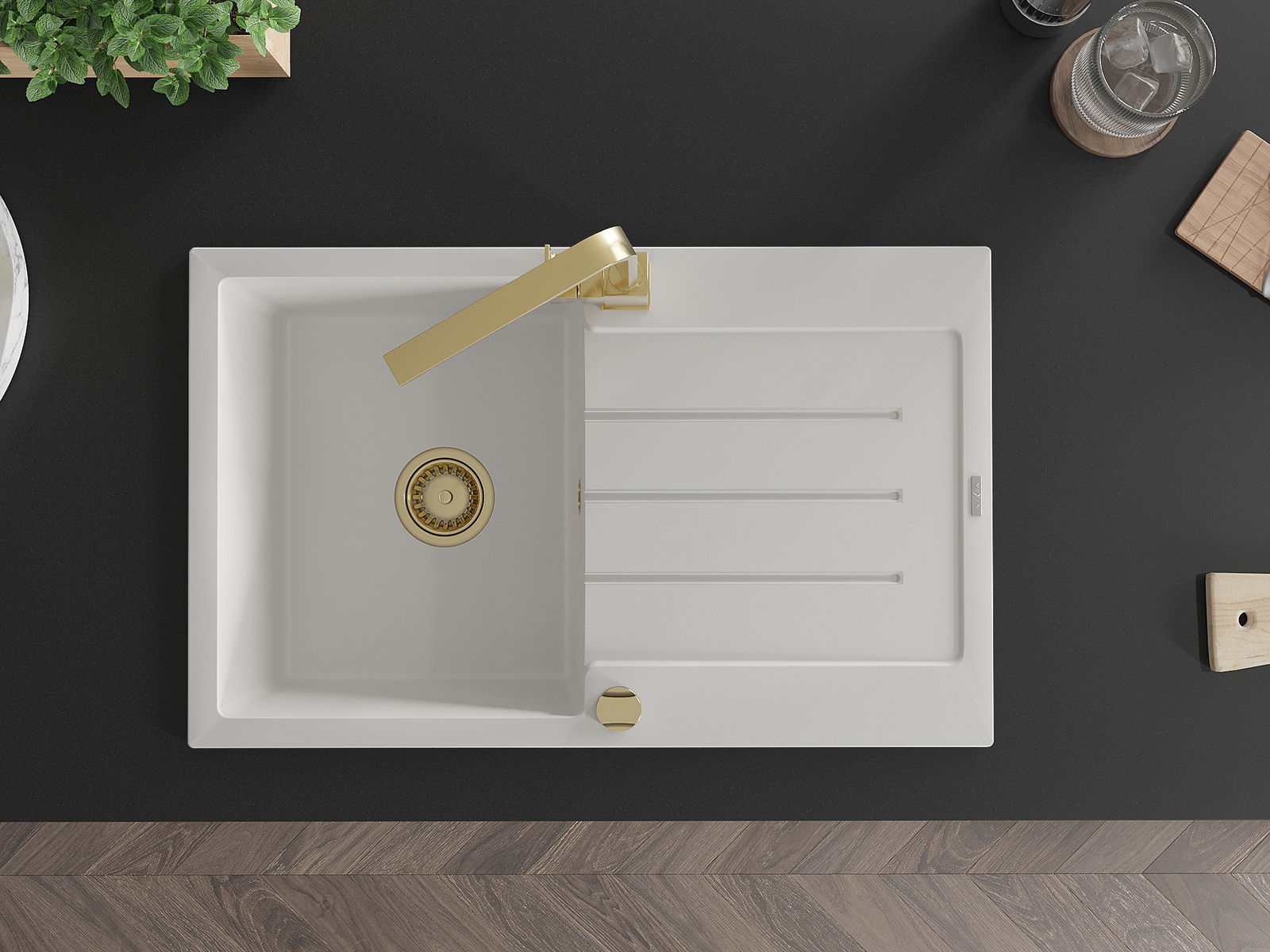 Mexen Bruno granieten gootsteen 1-compartiment met afdruiprek en keukenkraan Rita, wit - 6513-20-670300-50
