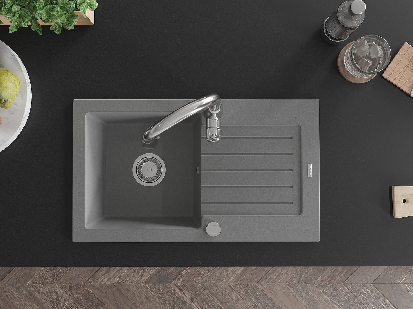 Mexen Pablo granieten spoelbak 1-komors met afdruiprek en keukenkraan Savita, grijs - 6510-71-672601-00