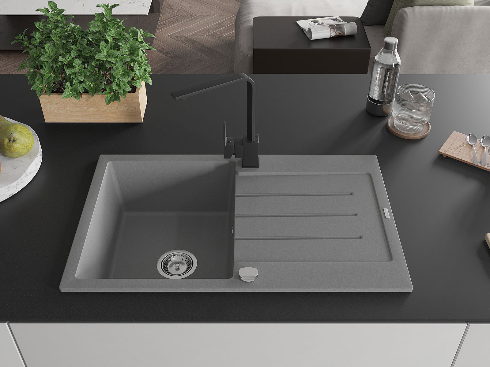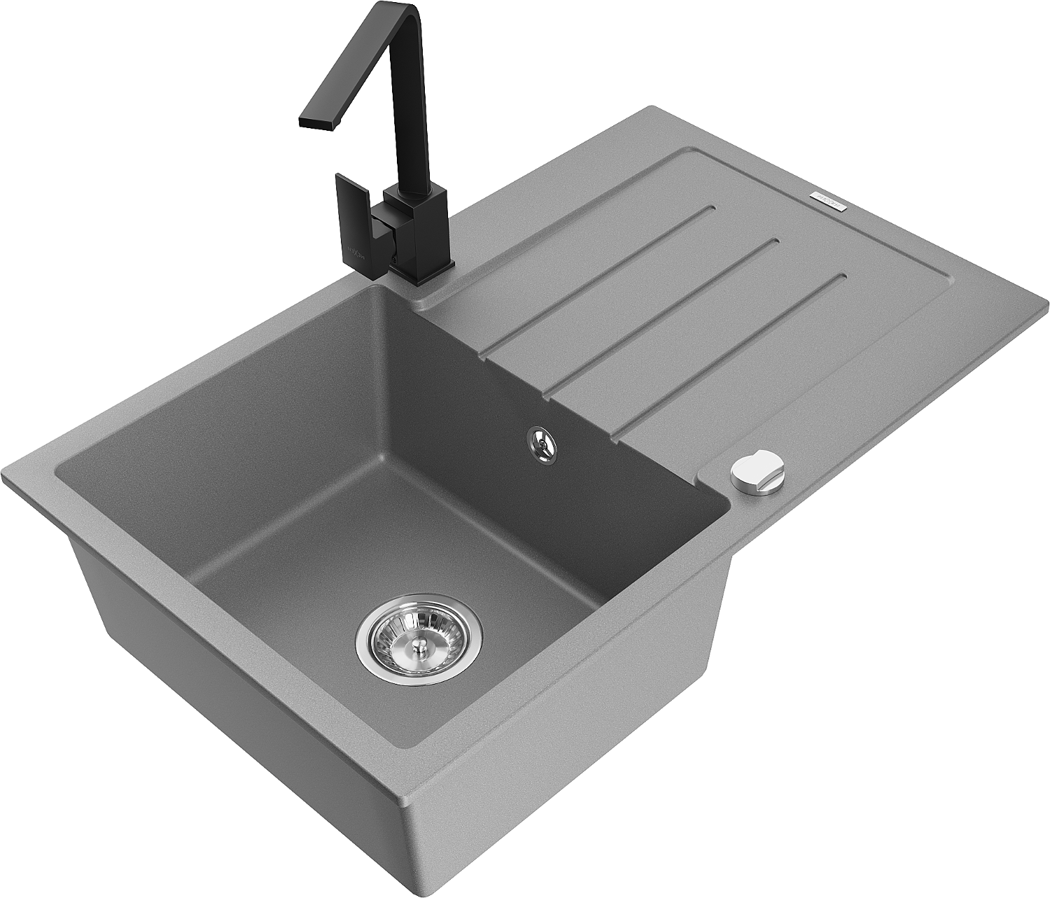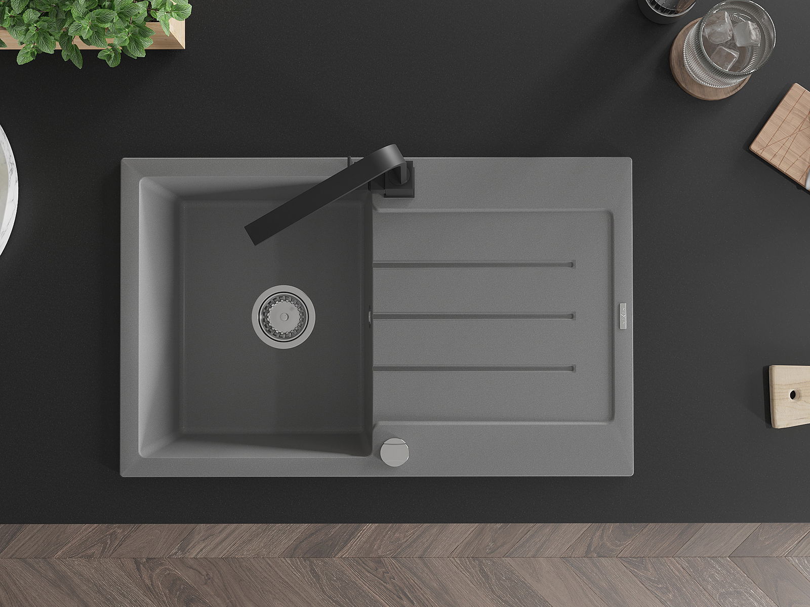 Mexen Bruno granieten gootsteen 1-komorige met afdruiprek en keukenkraan Rita, grijs - 6513-71-670300-70