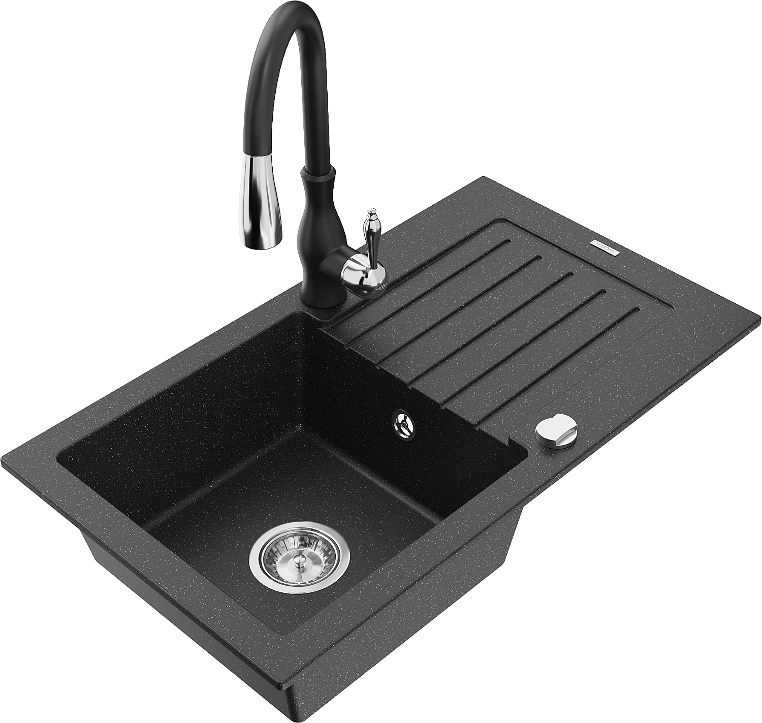 Mexen Pablo granieten spoelbak 1-komerig met afdruipplaat en keukenmengkraan Savita, zwart/zilver metallic - 6510-73-672601-70