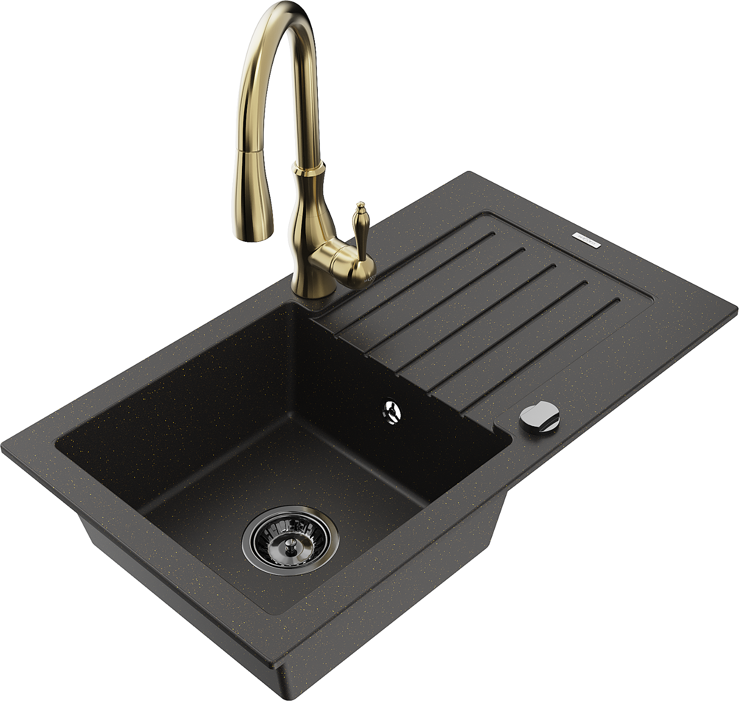 Mexen Pablo granieten spoelbak met 1 bak, afdruiprek en keukenmengkraan Savita, zwart/goud metallic - 6510-75-672601-50-B
