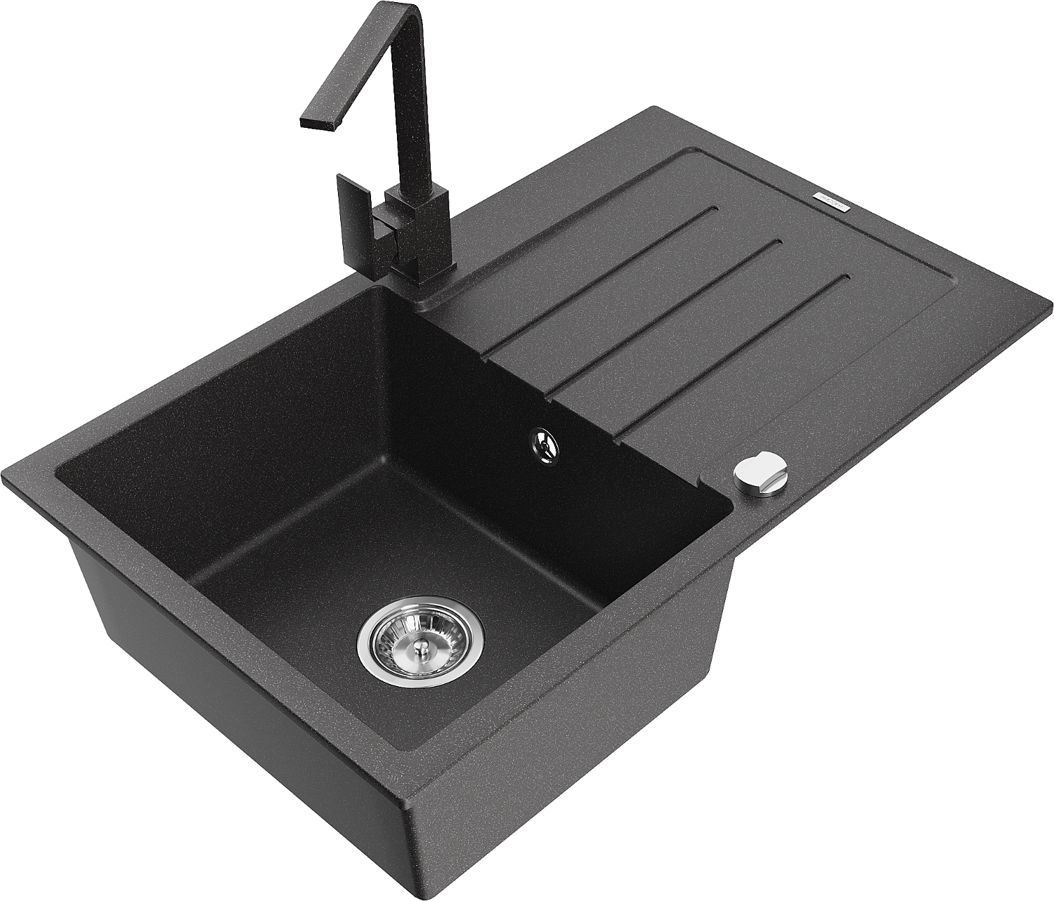 Mexen Bruno granieten gootsteen 1-kompartment met afdruiprek en keukenmengkraan Rita, zwart gespikkeld - 6513-76-670300-76
