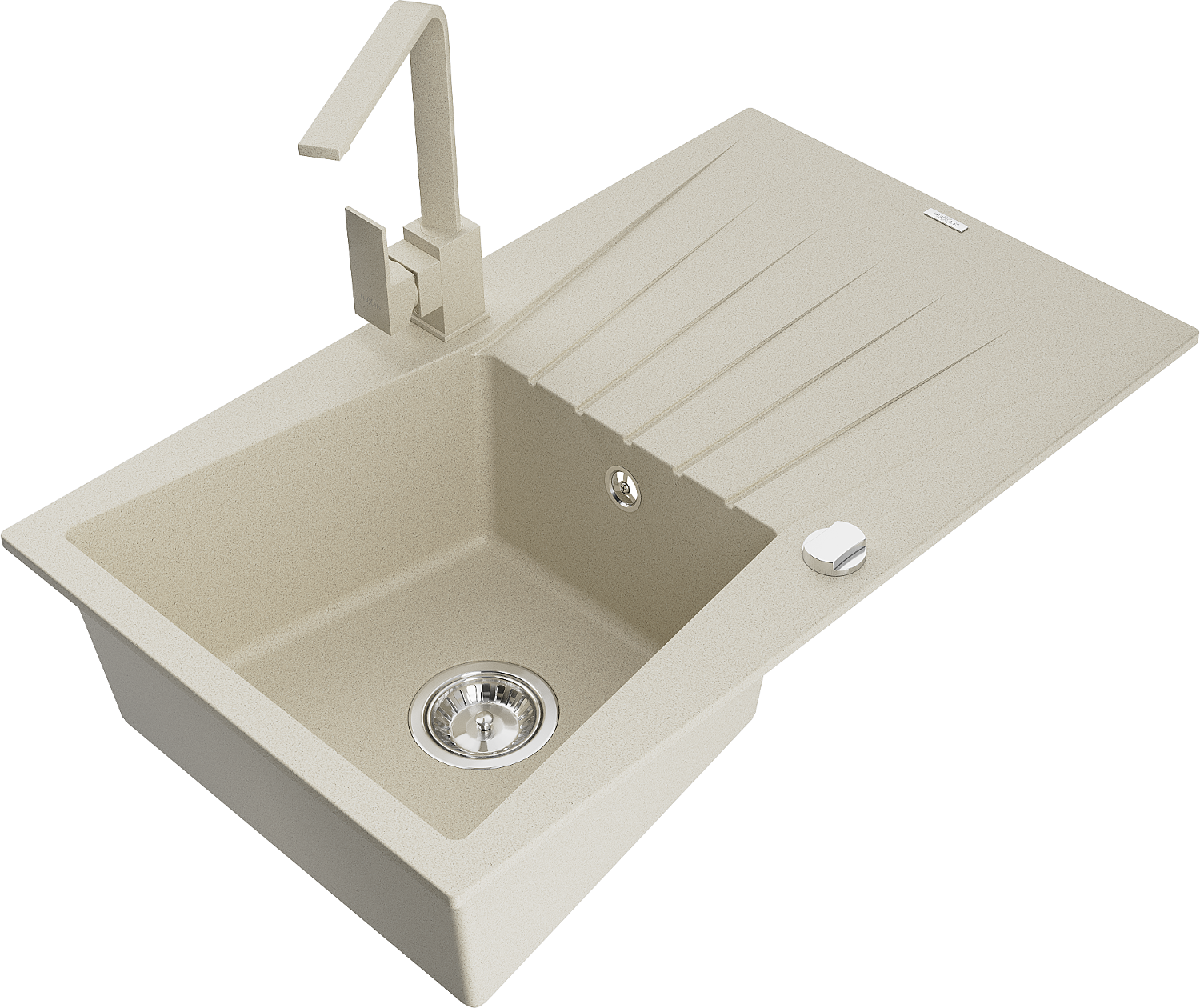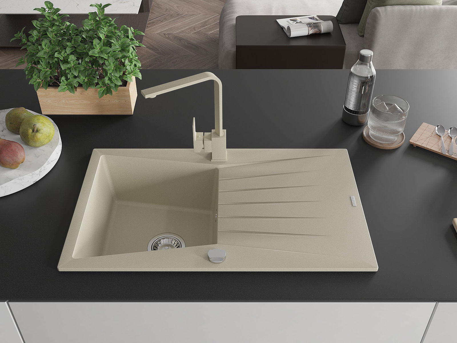 Mexen Cesar granieten gootsteen met 1 bak en afdruiprek en keukenkraan Rita, beige - 6514-69-670300-69