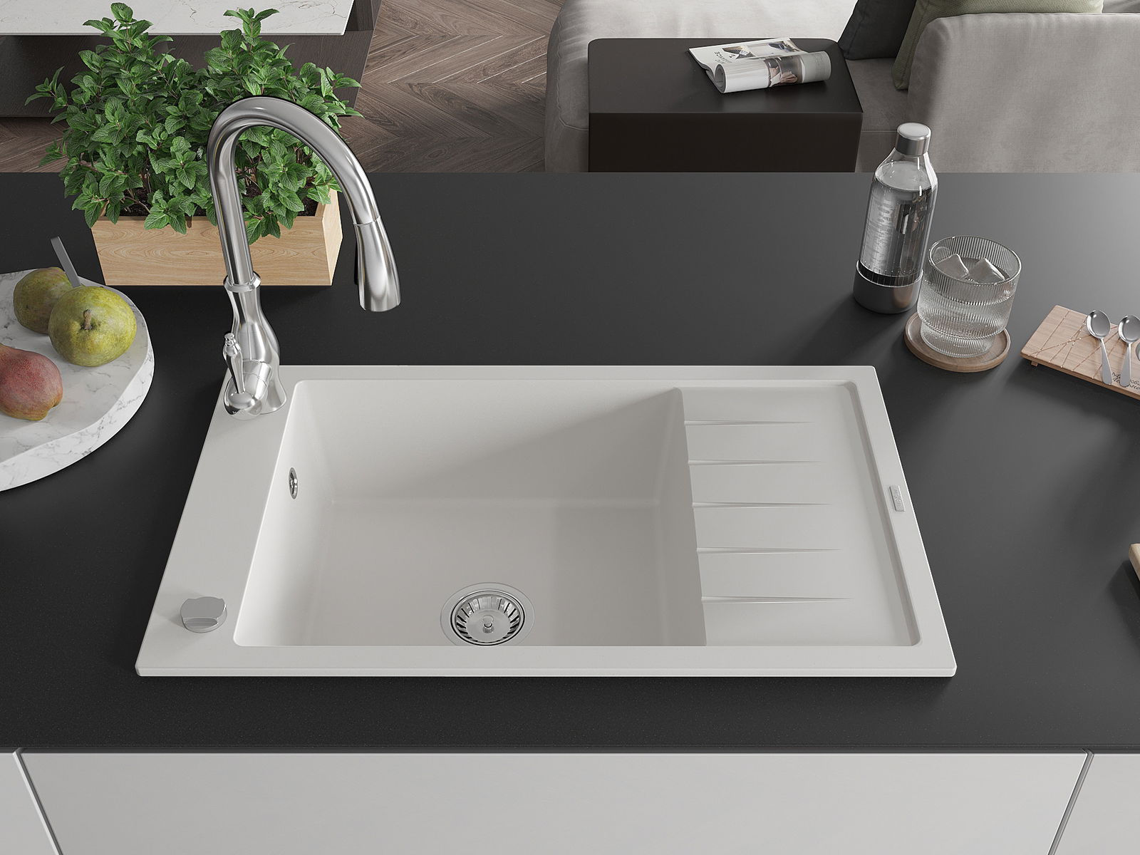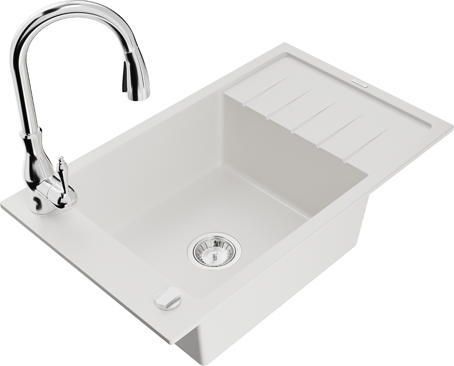 Mexen Elias granieten gootsteen 1-komorige met afdruiprek en keukenmengkraan Savita, wit - 6511-20-672601-00