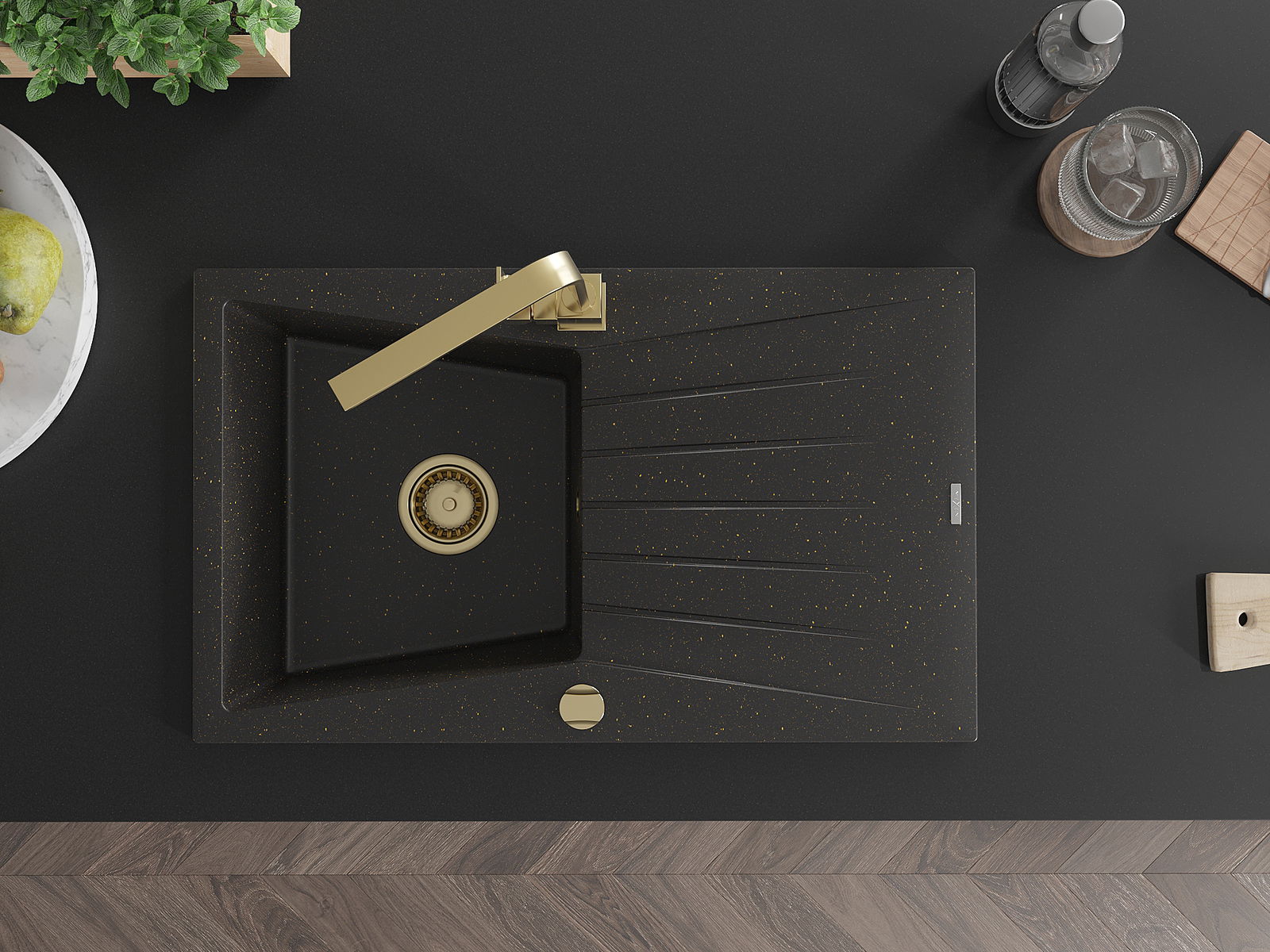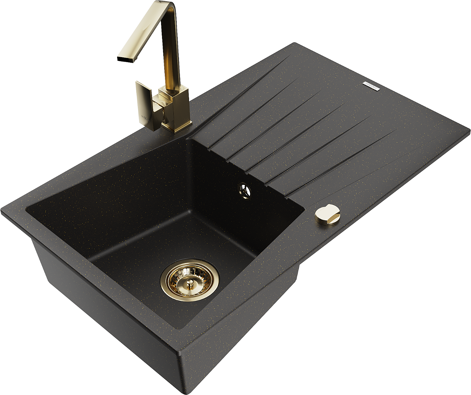 Mexen Cesar granieten spoelbak 1-kamer met afdruiprek en keukenmengkraan Rita, zwart/goud metallic - 6514-75-670300-50