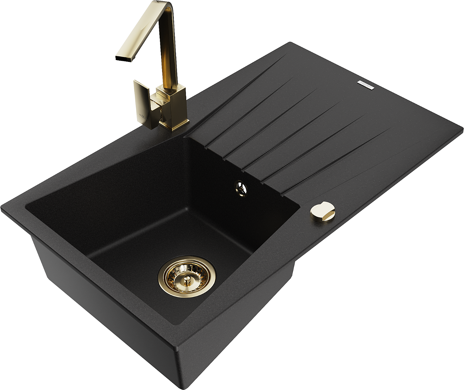 Mexen Cesar granieten spoelbak met 1 bak, afdruiprek en keukenkraan Rita, zwart - 6514-77-670300-50