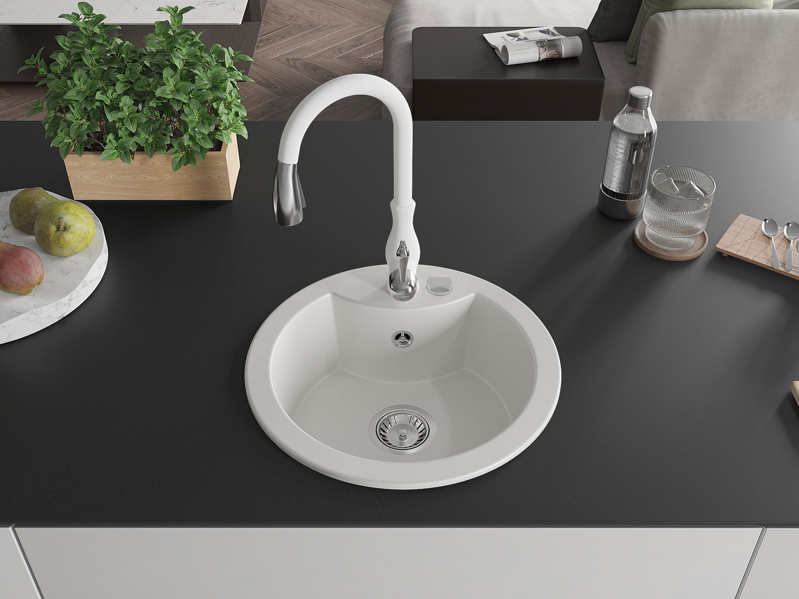 De spoelbak heeft een voorgesneden gat met een diameter van 35 mm voor eenvoudige verwijdering. Dit gat kan bijvoorbeeld worden gebruikt om een vloeistofdispenser te installeren, waardoor plastic flessen in de keuken overbodig zijn en een elegante afwerking ontstaat.