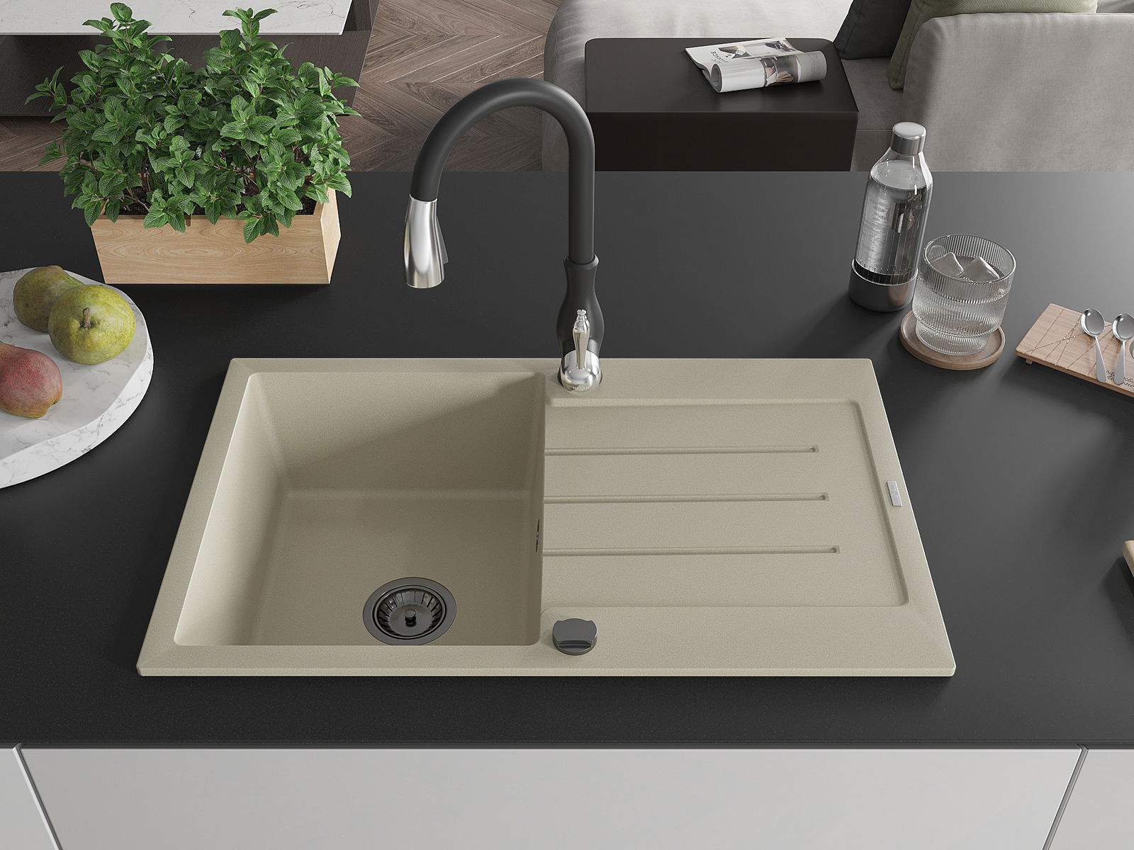 Mexen Bruno granieten gootsteen 1-compartiment met afdruiprek en keukenkraan Savita, beige - 6513-69-672601-70