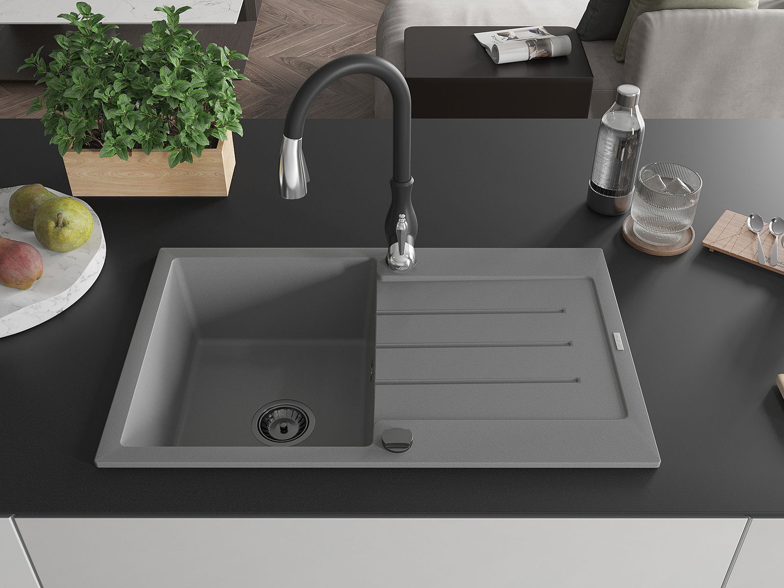 Mexen Bruno granieten gootsteen 1-kompartment met afdruiprek en keuken mengkraan Savita, grijs - 6513-71-672601-70-B
