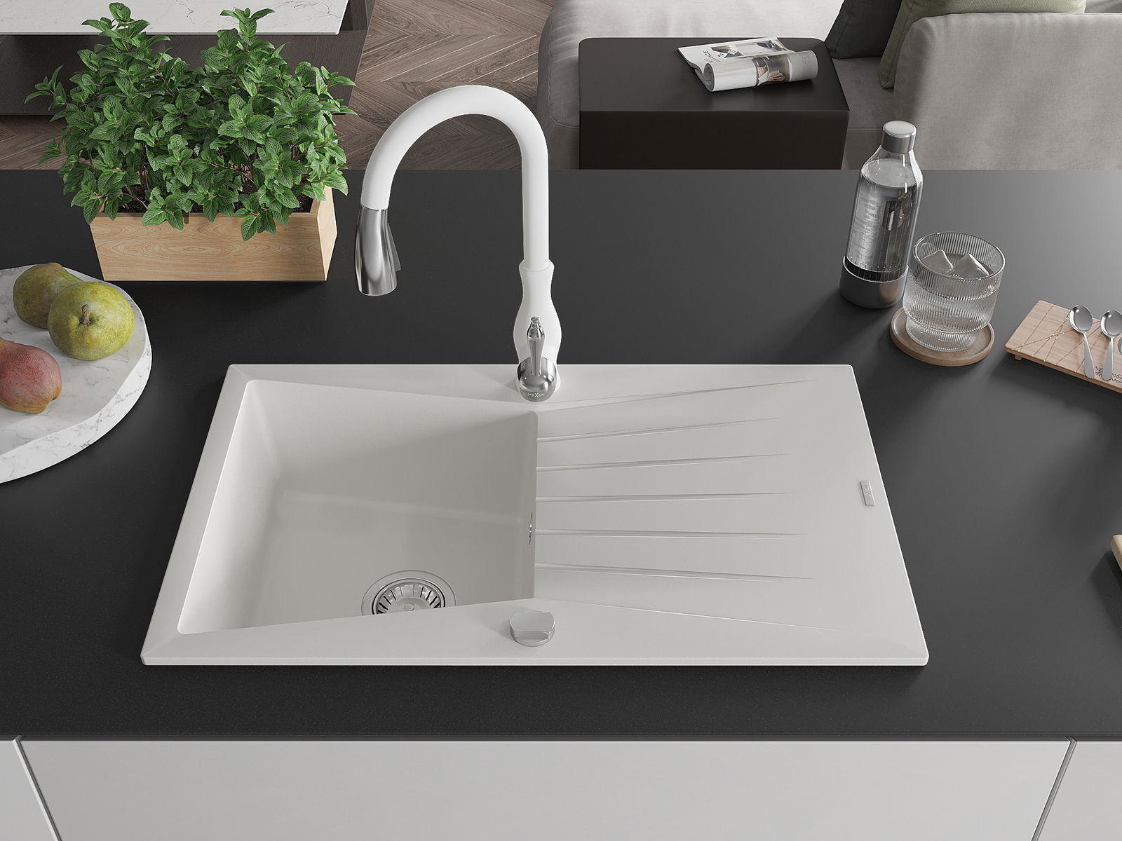 Mexen Cesar granieten gootsteen 1-komerig met afdruiprek en keukenkraan Savita, wit - 6514-20-672601-20