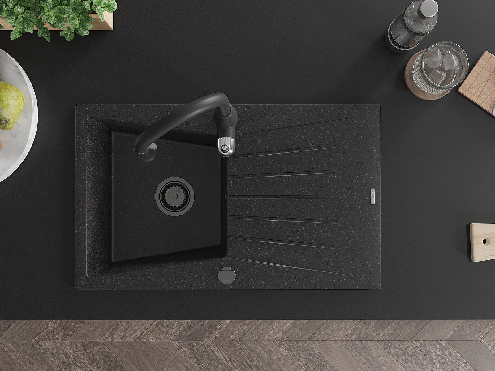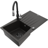 Mexen Cesar granieten spoelbak met 1 bak met afdruiprek en keukenmengkraan Savita, zwart/zilver - 6514-73-672601-70-B