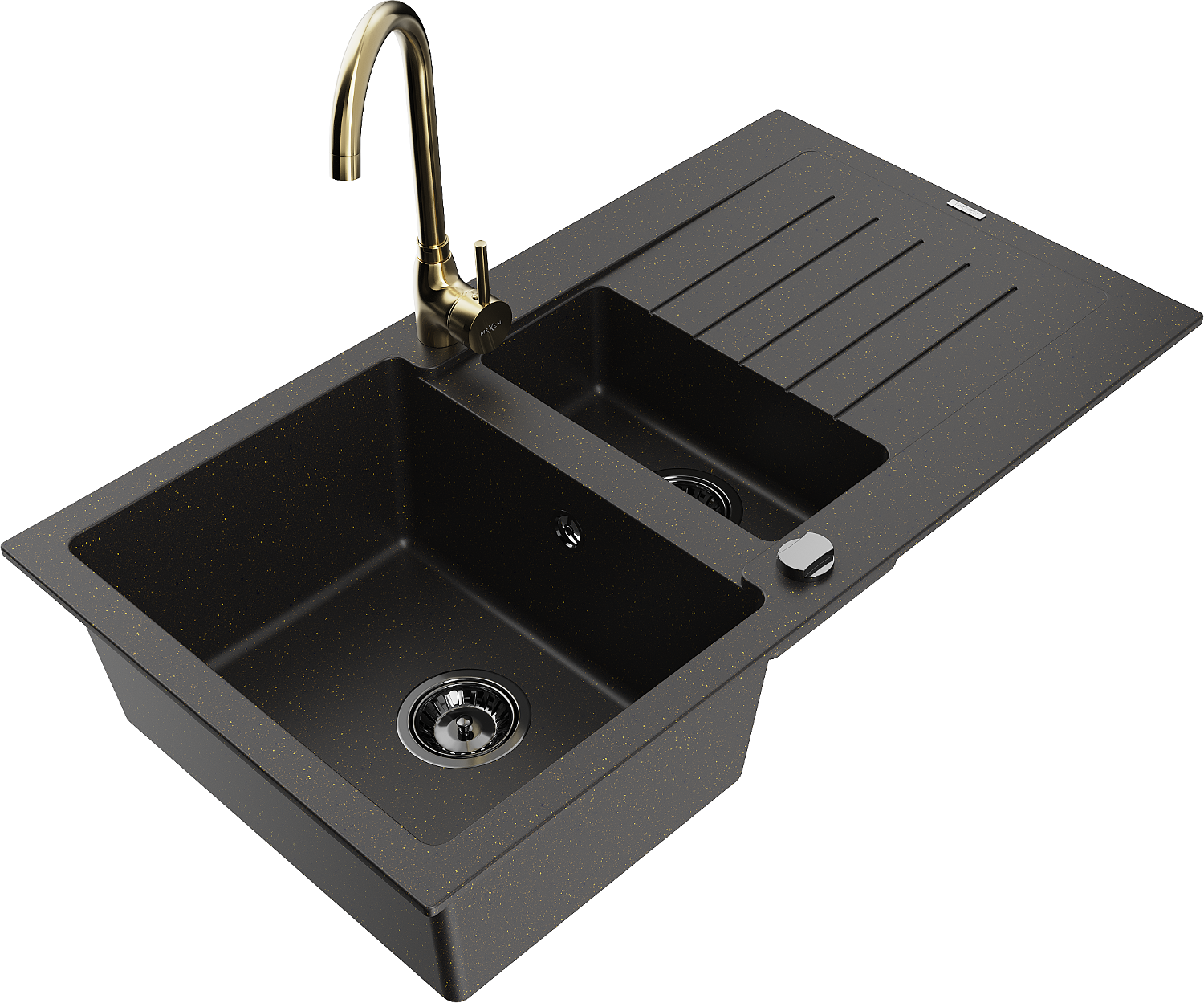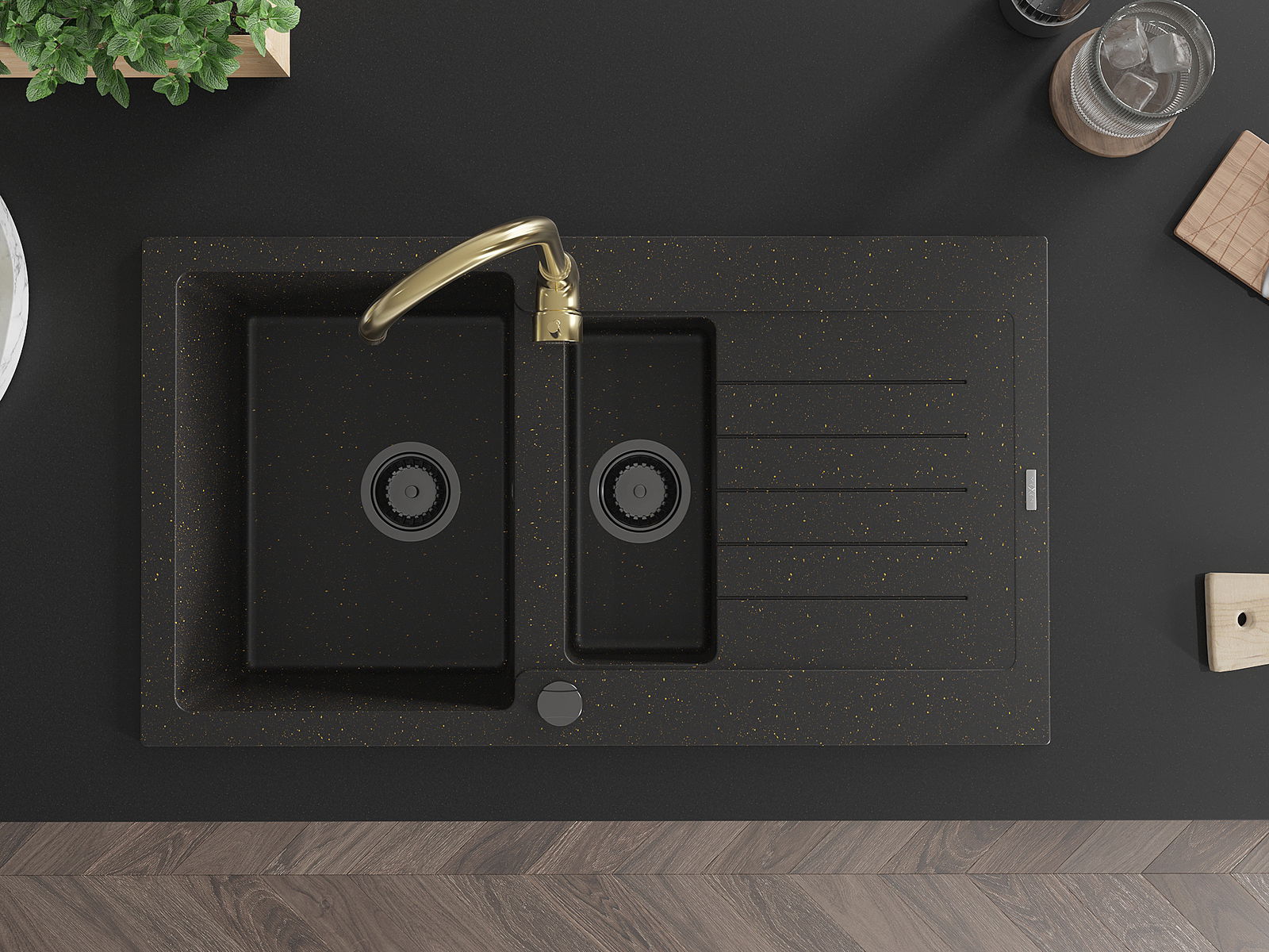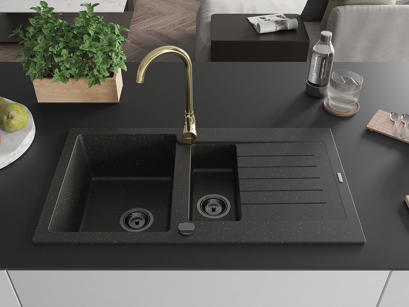 Mexen Matias granieten gootsteen 1,5-komorige met afdruipplaat en keukenmengkraan Telma, zwart/goud - 6502-75-670200-50-B