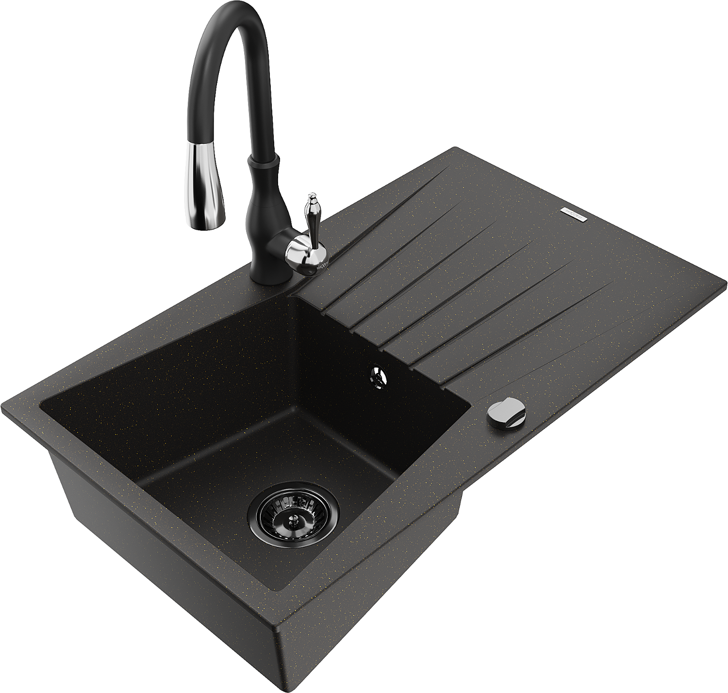 Mexen Cesar granieten spoelbak 1-kompartment met afdruiprek en keukenkraan Savita, zwart/goud metallic - 6514-75-672601-70-B
