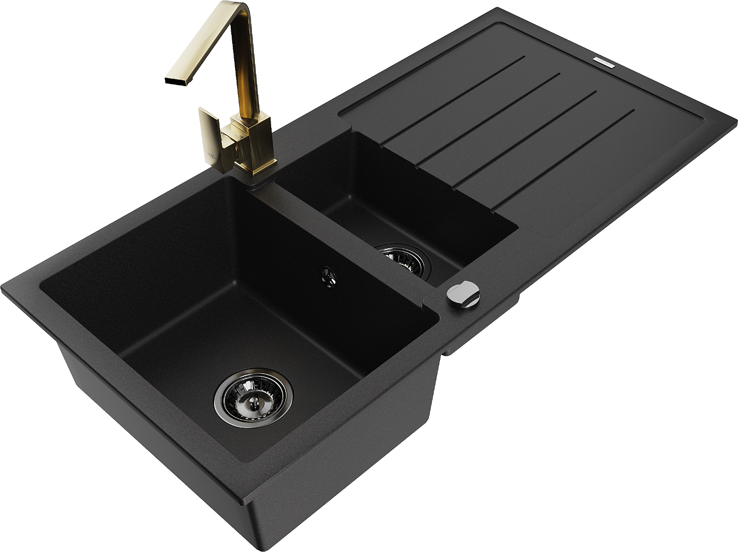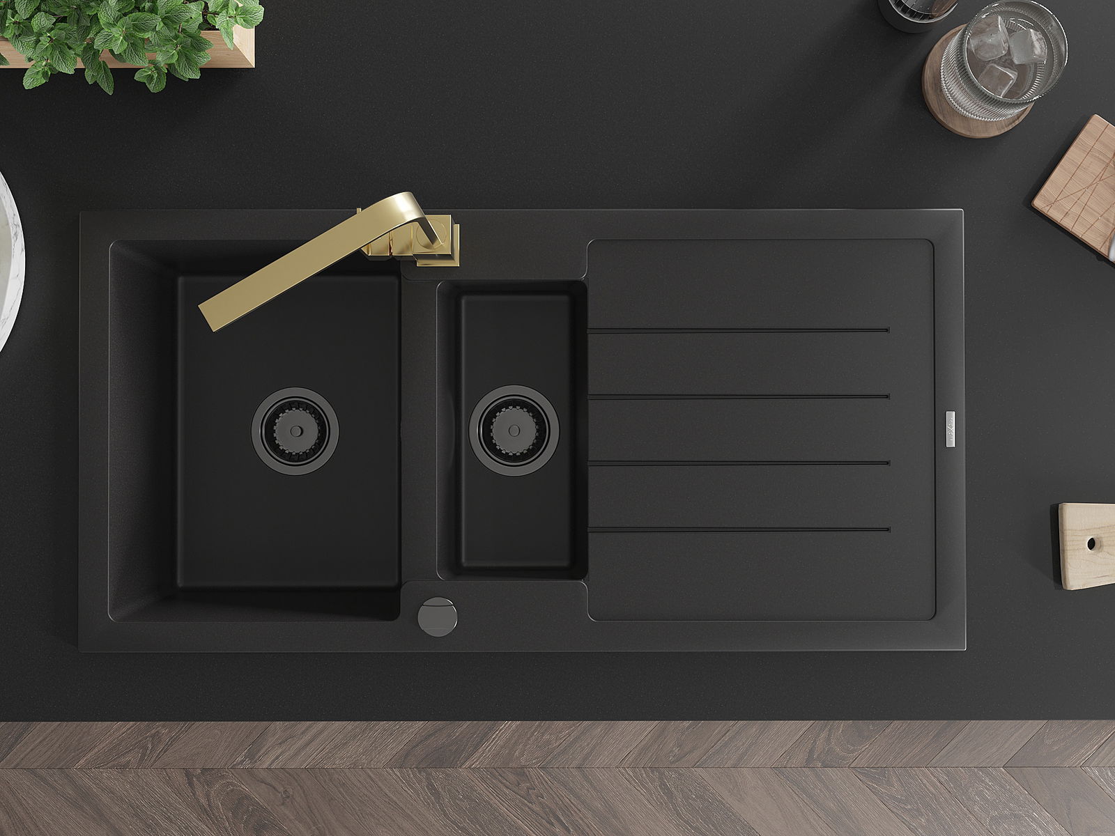 Mexen Andres granieten spoelbak 1,5-komor met afdruiprek en keukenmengkraan Rita, zwart/goud metallic- 6515-75-670300-50-B