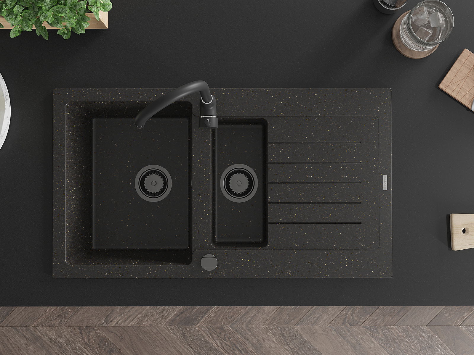 Mexen Matias granieten spoelbak 1,5-kamer met afdruiprek en keukenkraan Telma, zwart/goud - 6502-75-670200-70-B