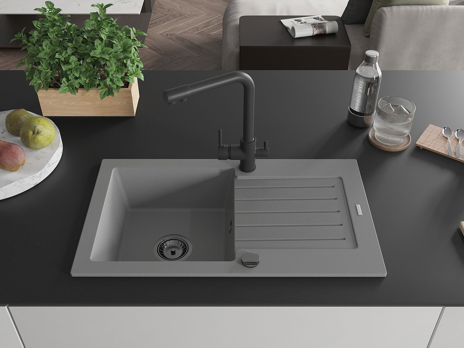 De gootsteen is gemaakt van hoogwaardig graniet. Het vormt een elegante en vooral praktische aanvulling op elke keuken, ongeacht de stijl ervan. De hoge kwaliteit en duurzaamheid van graniet garanderen jarenlang gebruik.