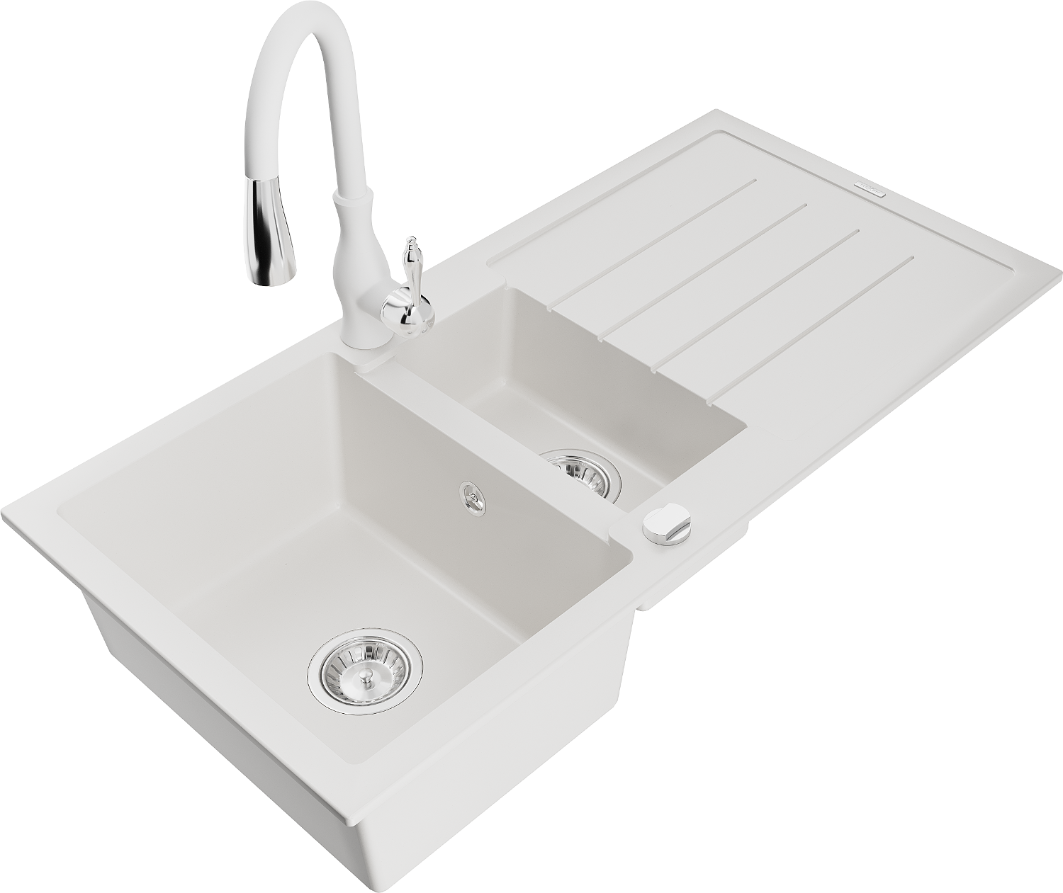 Mexen Andres granieten gootsteen 1,5-kompartiment met afdruiprek en keukenmengkraan Savita, wit - 6515-20-672601-20