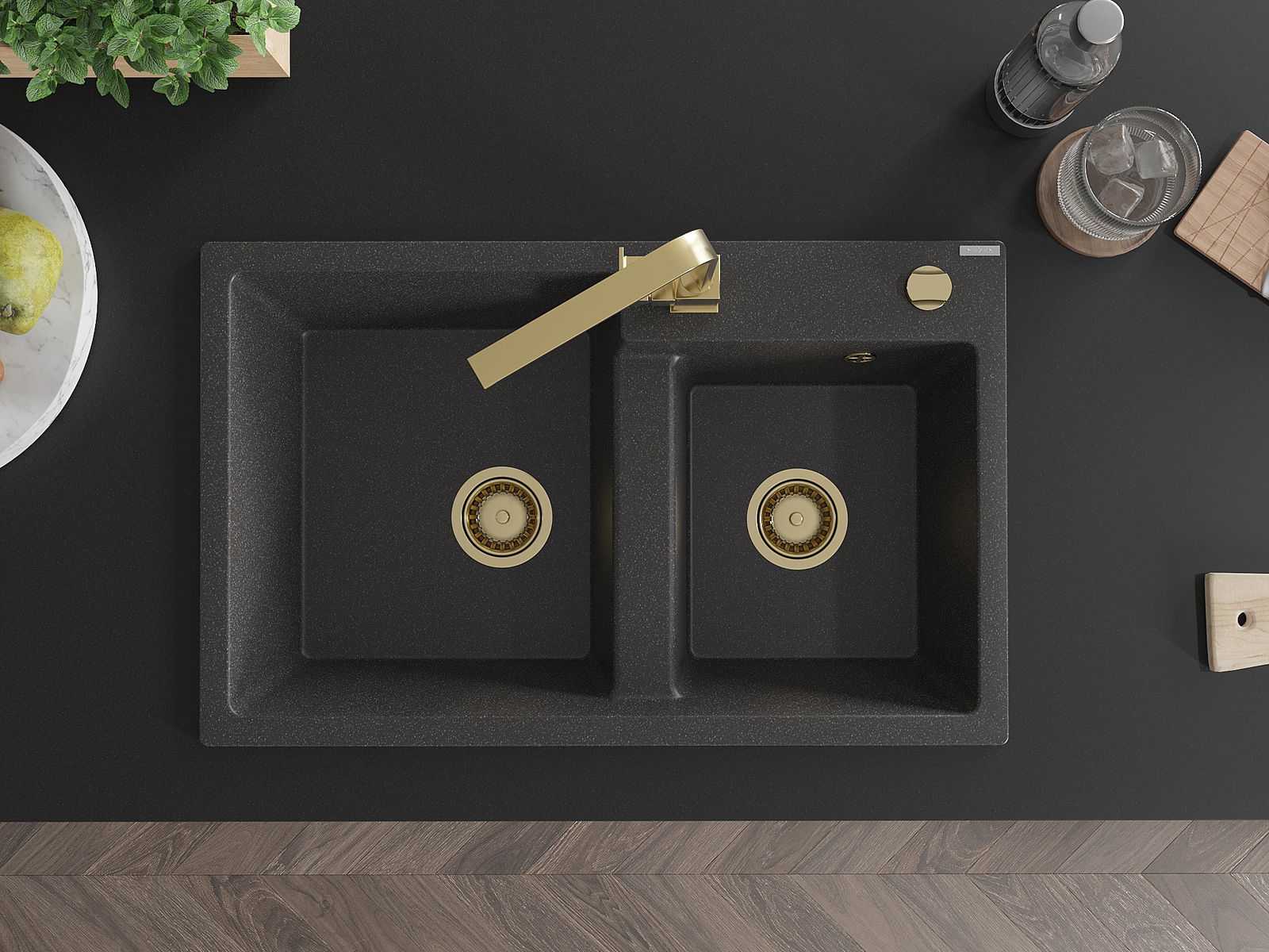 Mexen Tomas granieten spoelbak 2-kamerig met keukenmengkraan Rita, zwart gespikkeld - 6516-76-670300-50