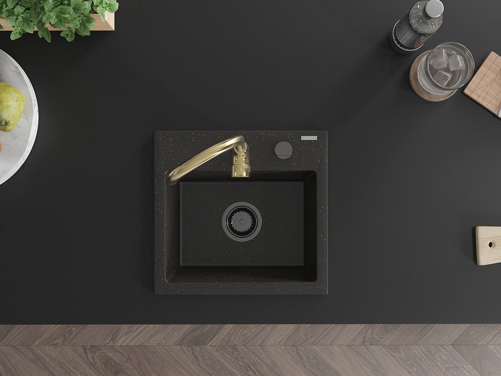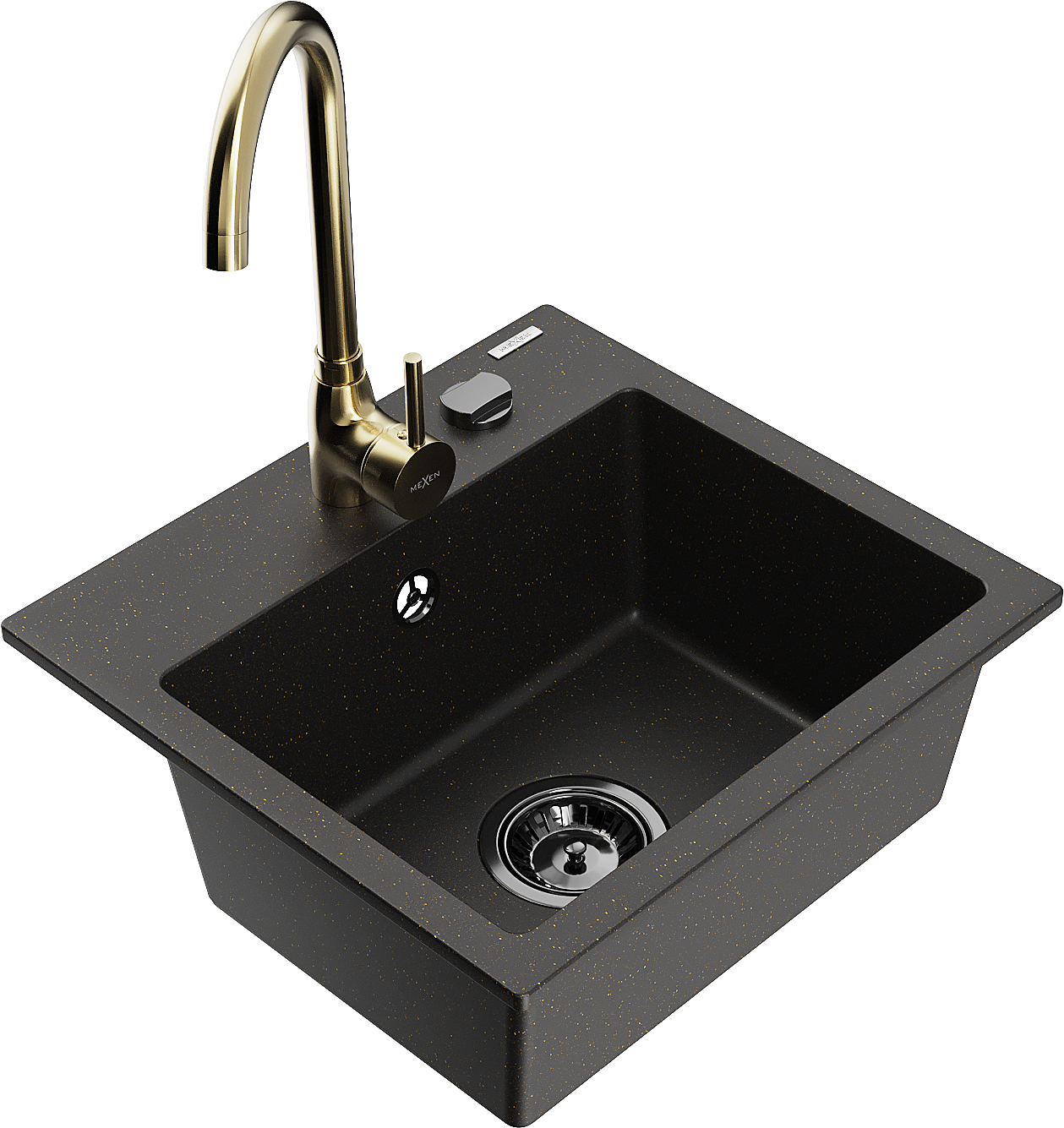 Mexen Milo granieten gootsteen 1-komor met keukenmengkraan Telma, zwart/goud - 6505-75-670200-50-B