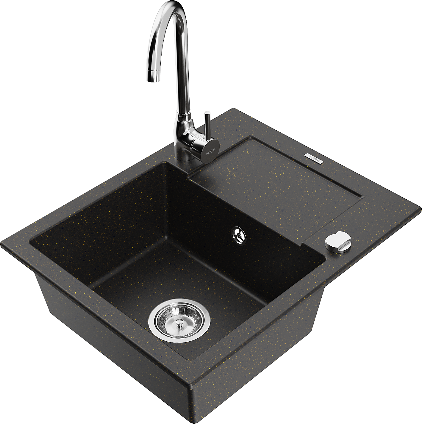 Mexen Enzo granieten spoelbak 1-baks met afdruiprek en keukenmengkraan Telma, zwart/goud - 6506-75-670200-00