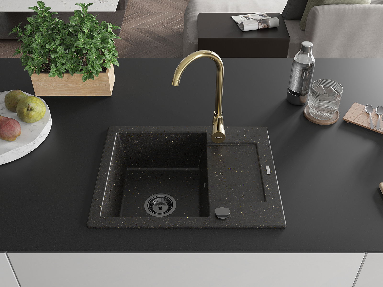 Mexen Enzo granieten spoelbak met 1 bak en afdruiprek en keukenmengkraan Telma, zwart/goud - 6506-75-670200-50-B