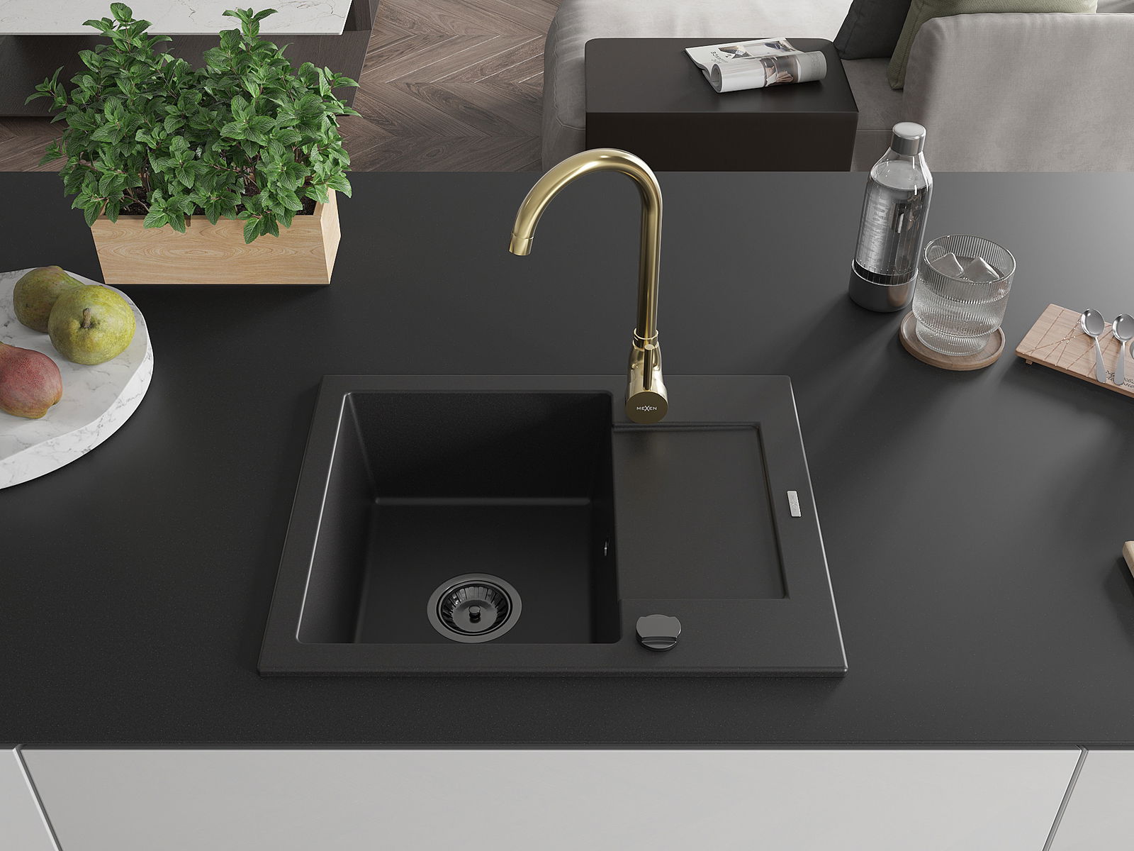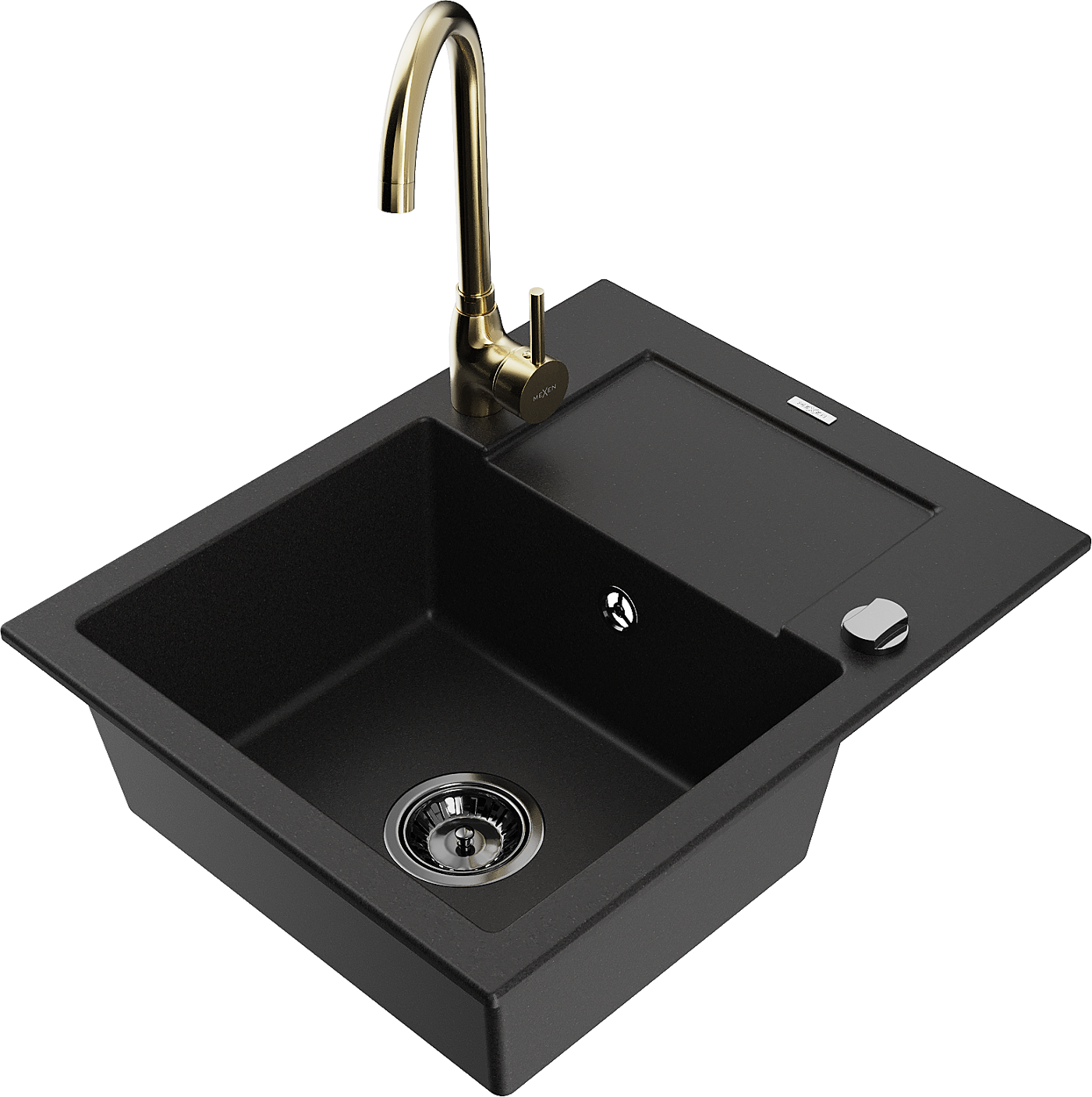 Mexen Enzo granieten spoelbak 1-komerig met afdruiprek en Telma keukenkraan, zwart - 6506-77-670200-50-B