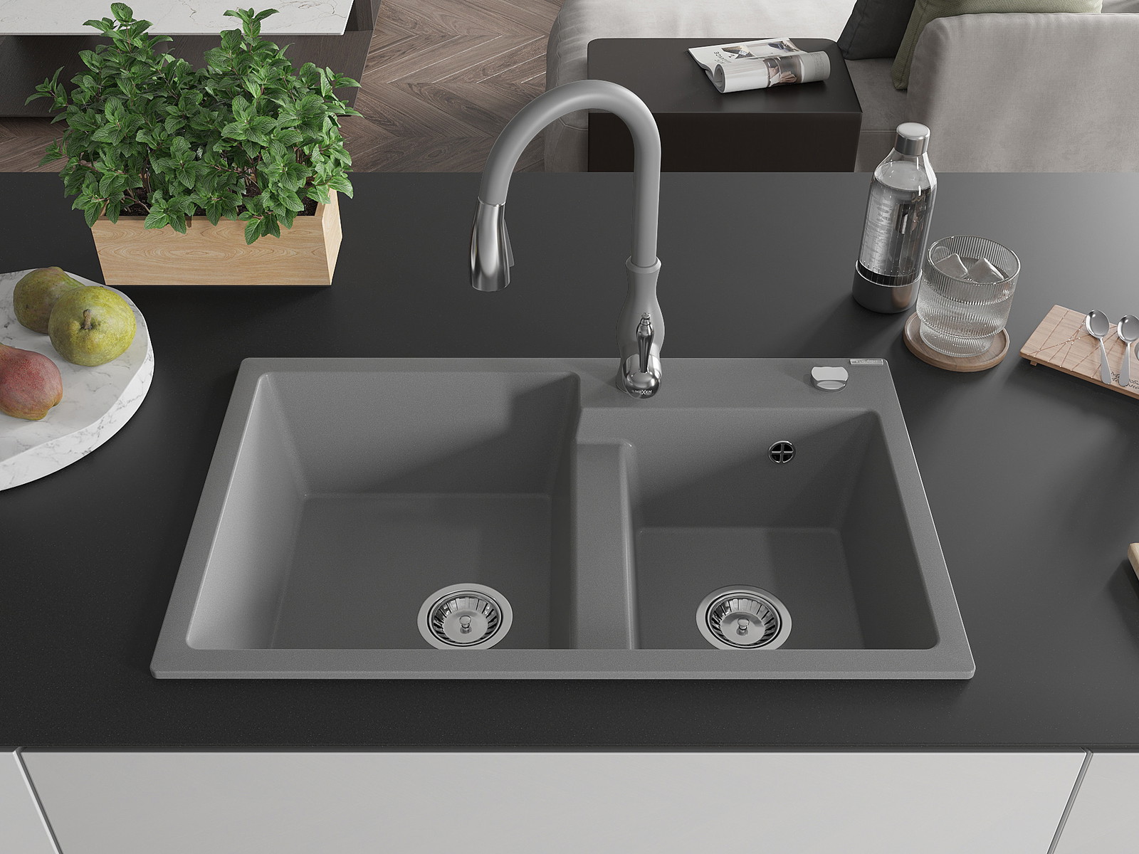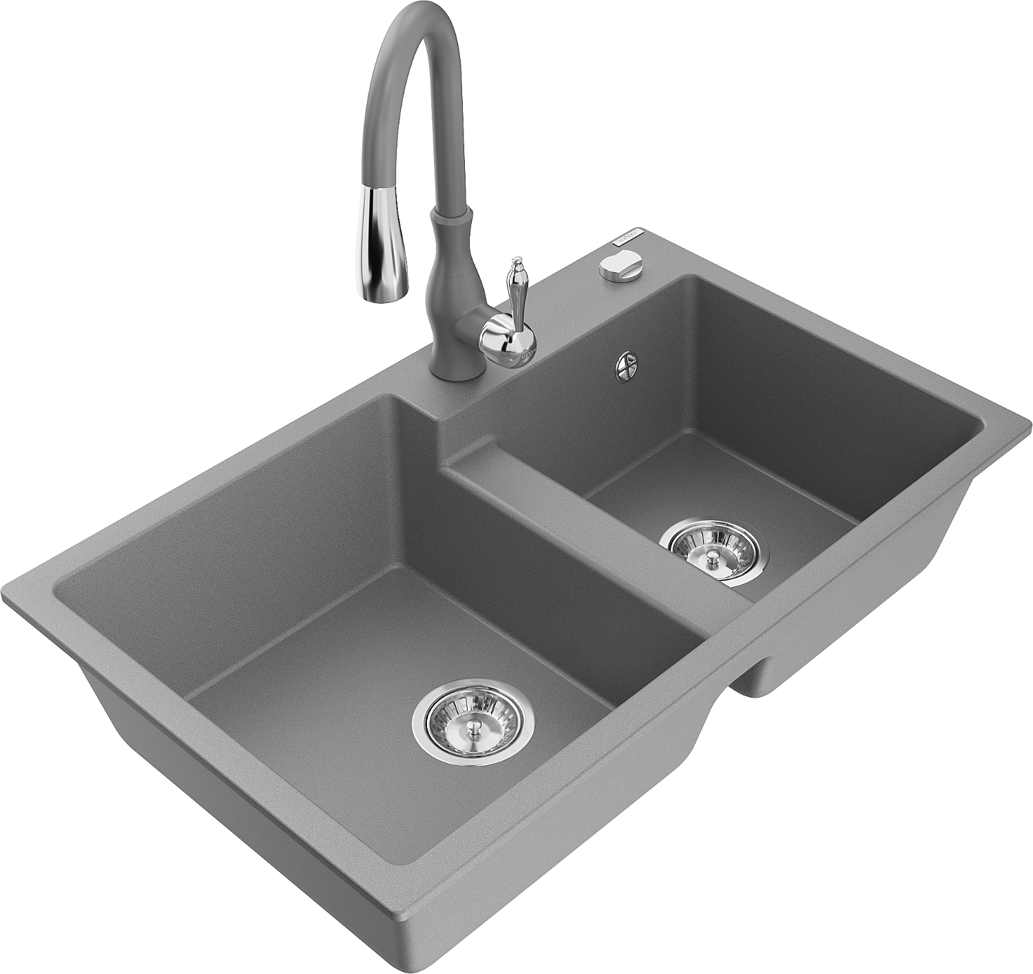 Mexen Tomas granieten spoelbak met 2 kommen en keukenkraan Savita, grijs - 6516-71-672601-71