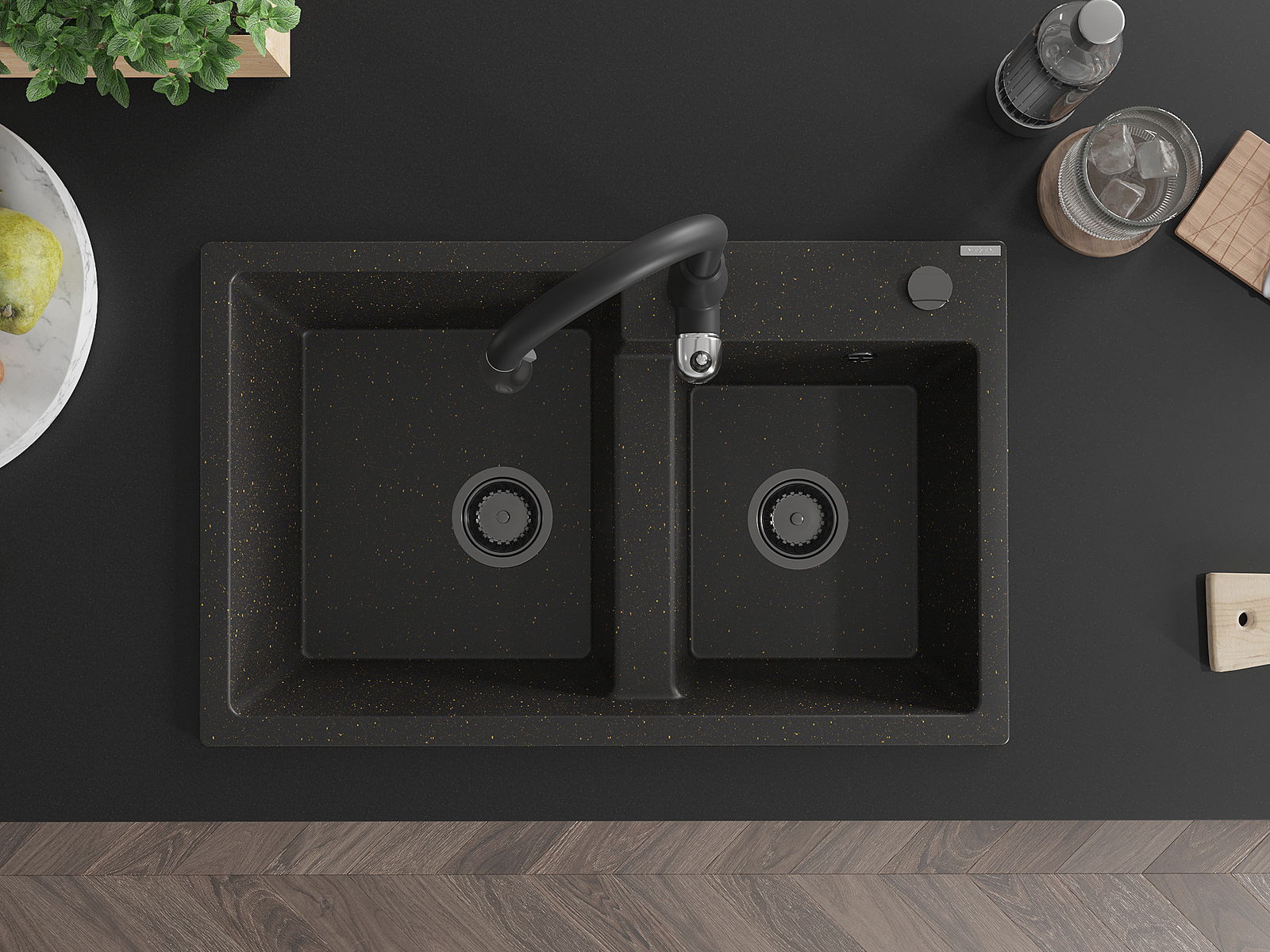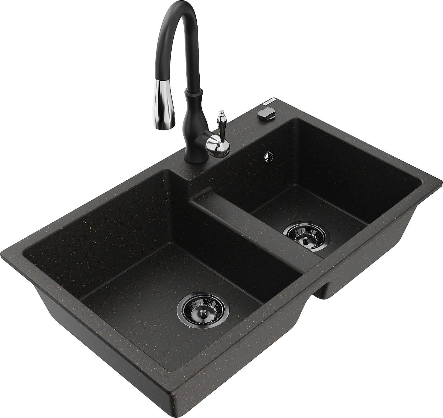 Mexen Tomas granieten gootsteen met 2 kommen en keukenkraan Savita, zwart/goud metallic - 6516-75-672601-70-B