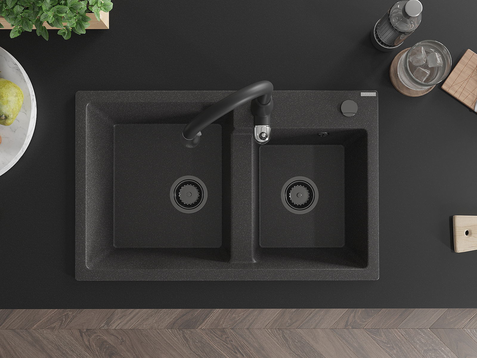 Mexen Tomas granieten spoelbak met 2 kamers en keukenmengkraan Savita, zwart gespikkeld - 6516-76-672601-70-B