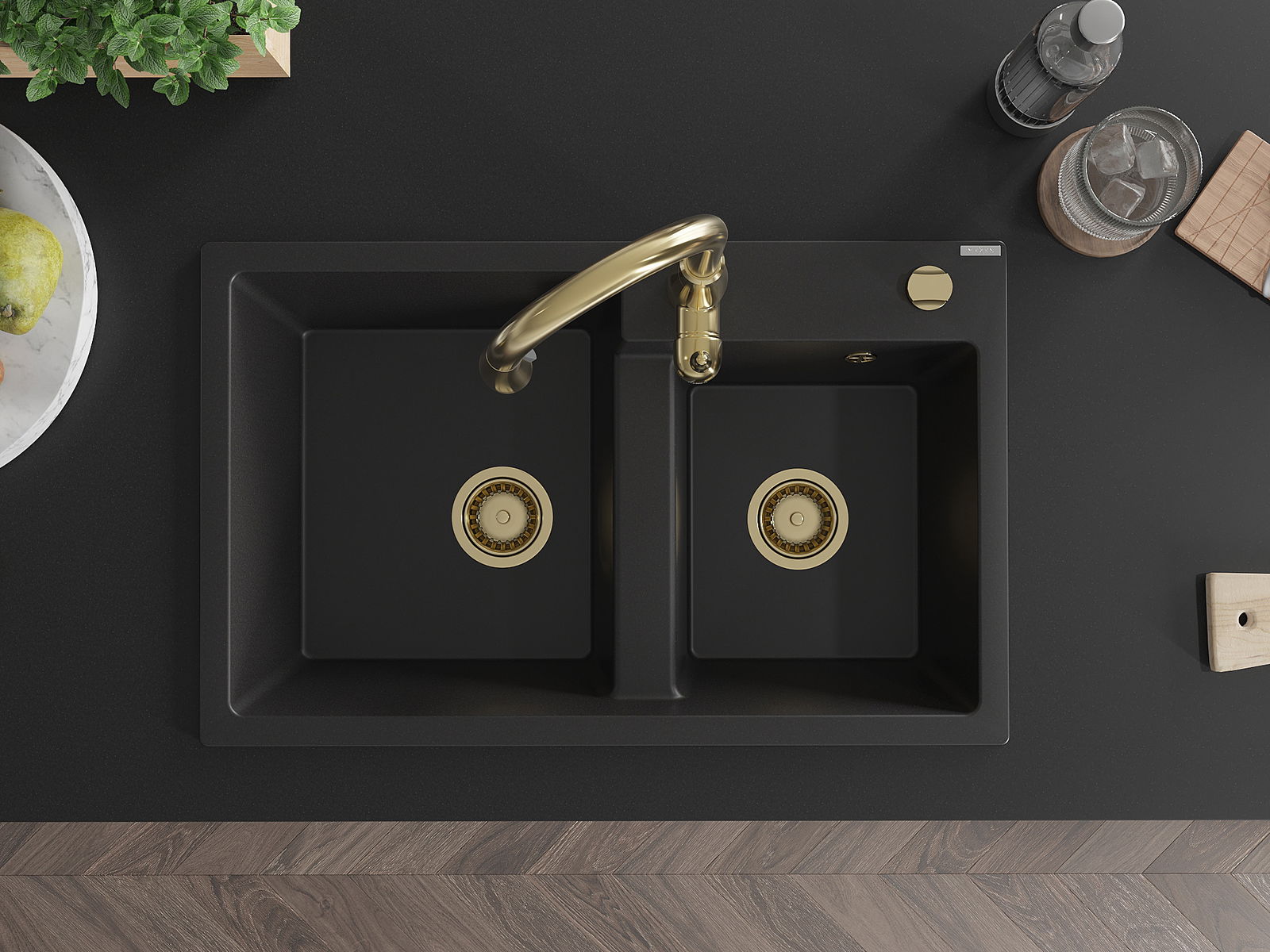 Mexen Tomas granieten gootsteen 2-kamerig met keukenmengkraan Savita, zwart - 6516-77-672601-50