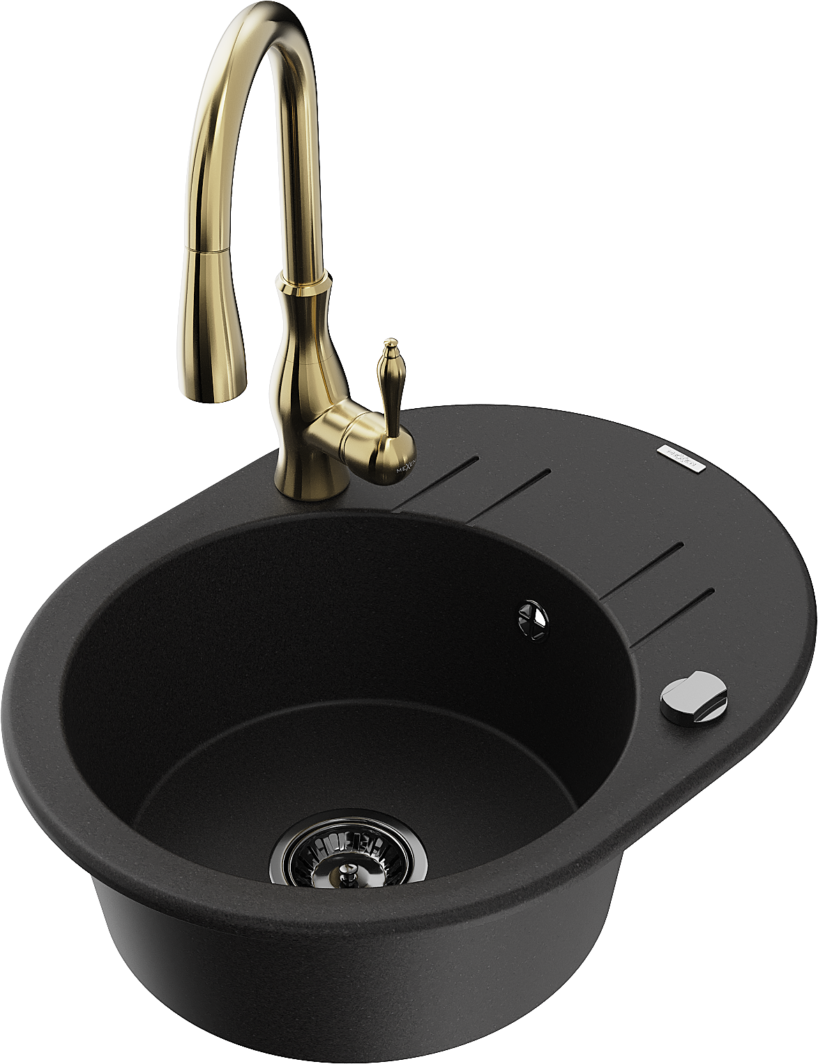 Mexen Kevin granieten spoelbak met 1 bak, druiprek en Savita keukenkraan, zwart - 6517-77-672601-50-B