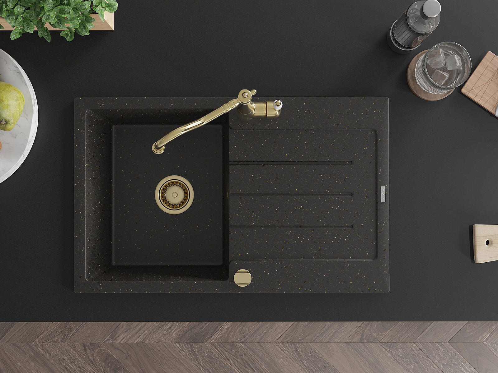 Mexen Bruno granieten spoelbak met 1 bak, afdruiprek en keukenmengkraan Carla, zwart/goud metallic - 6513-75-670700-50