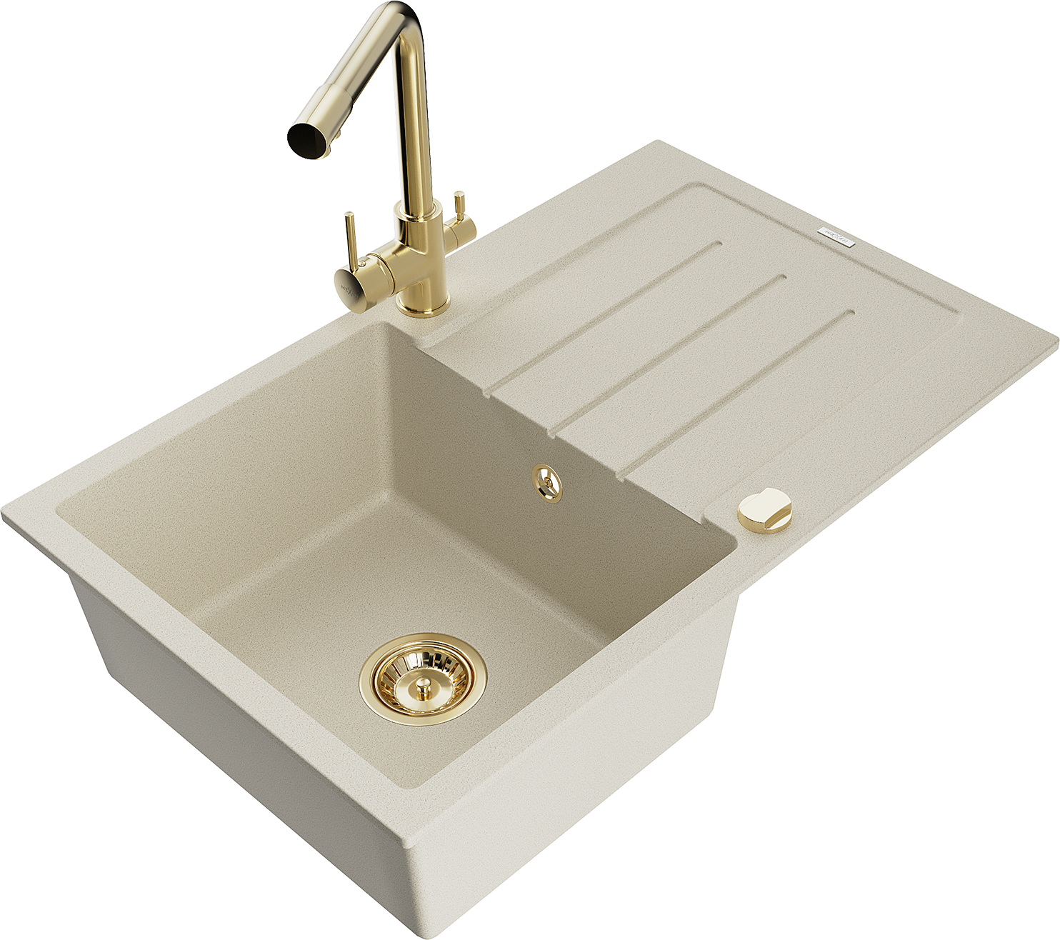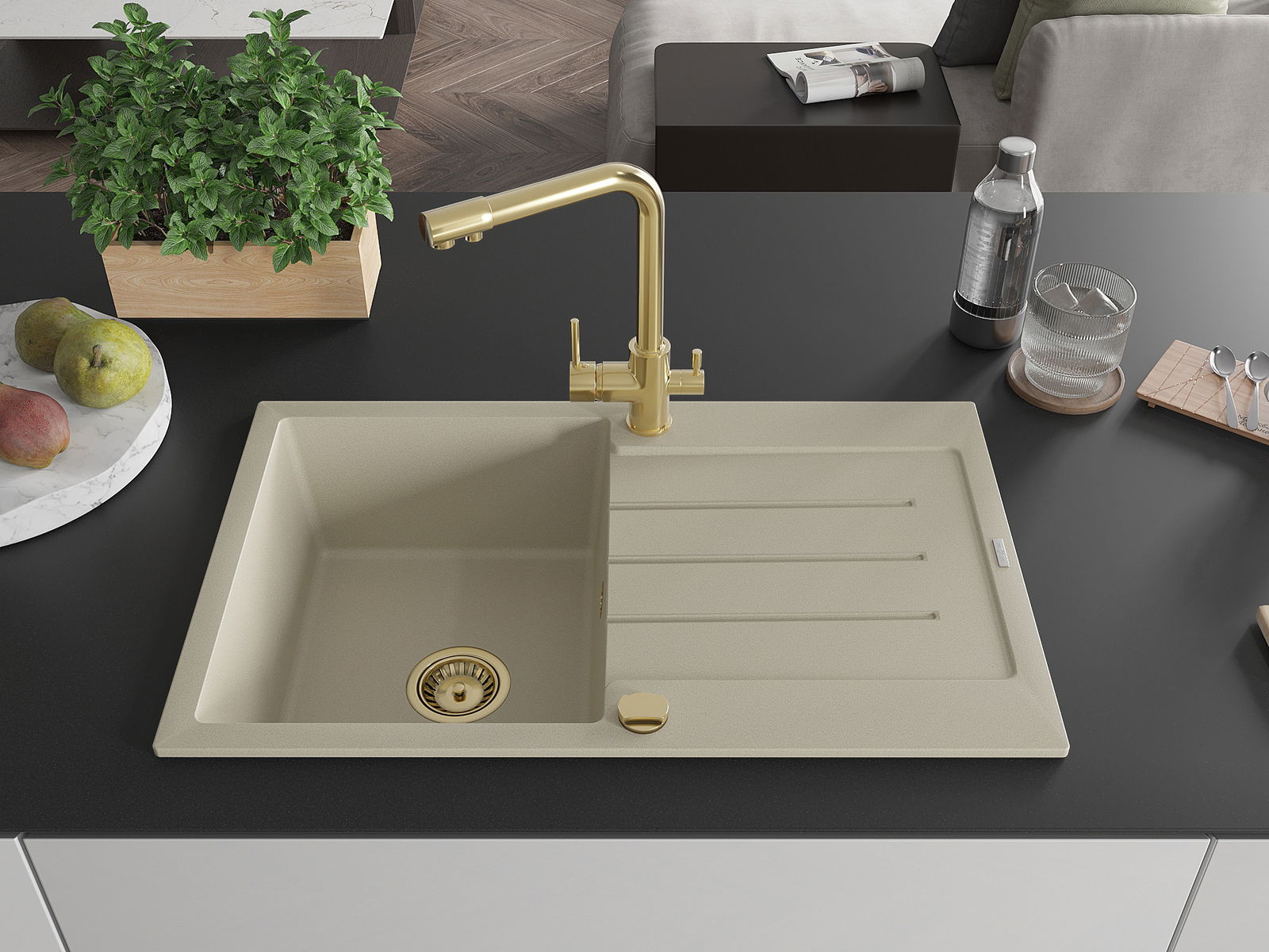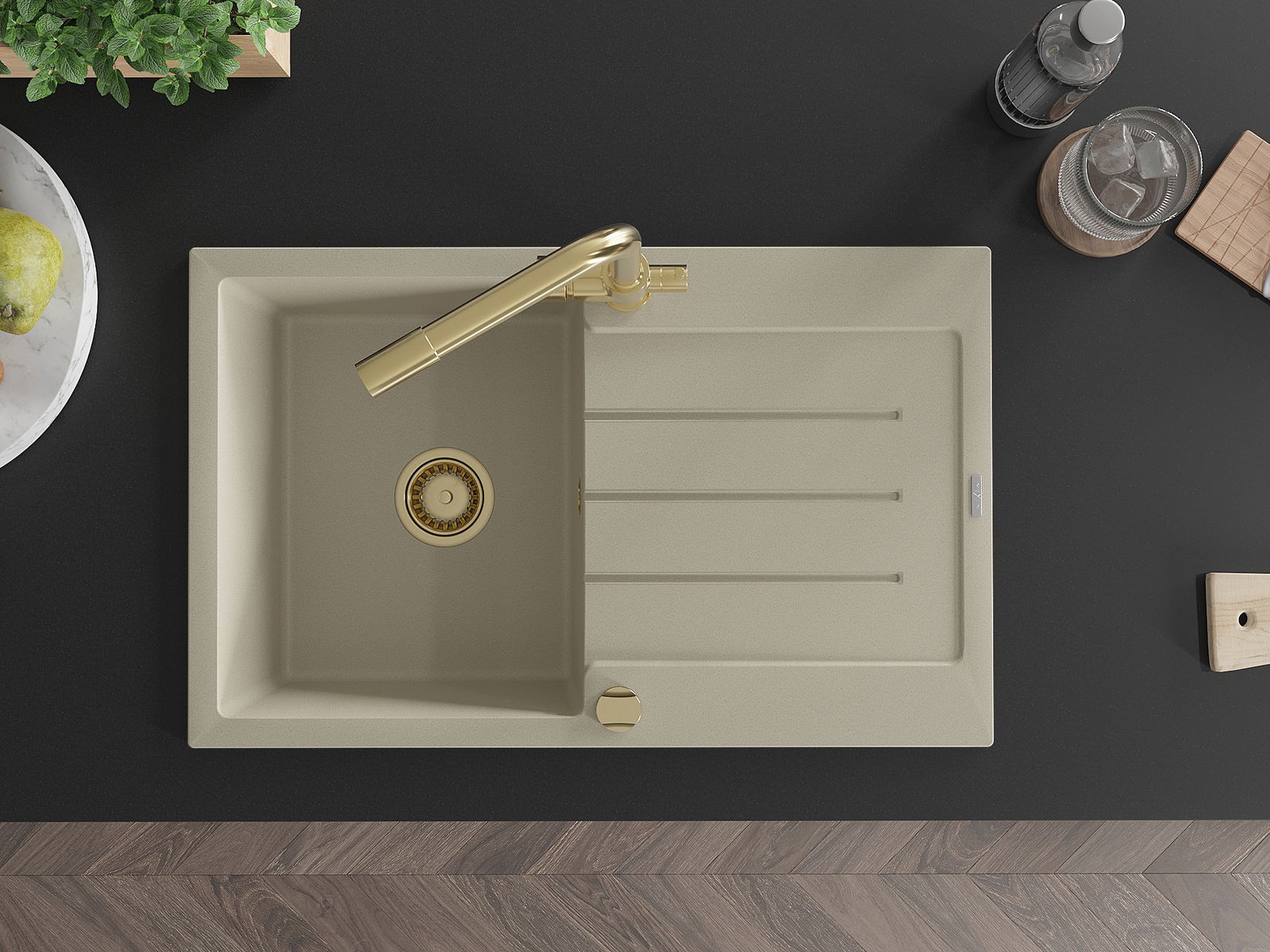 Mexen Bruno granieten gootsteen 1-komorige met afdruiprek en Duero keukenmengkraan, beige - 6513-69-671600-50