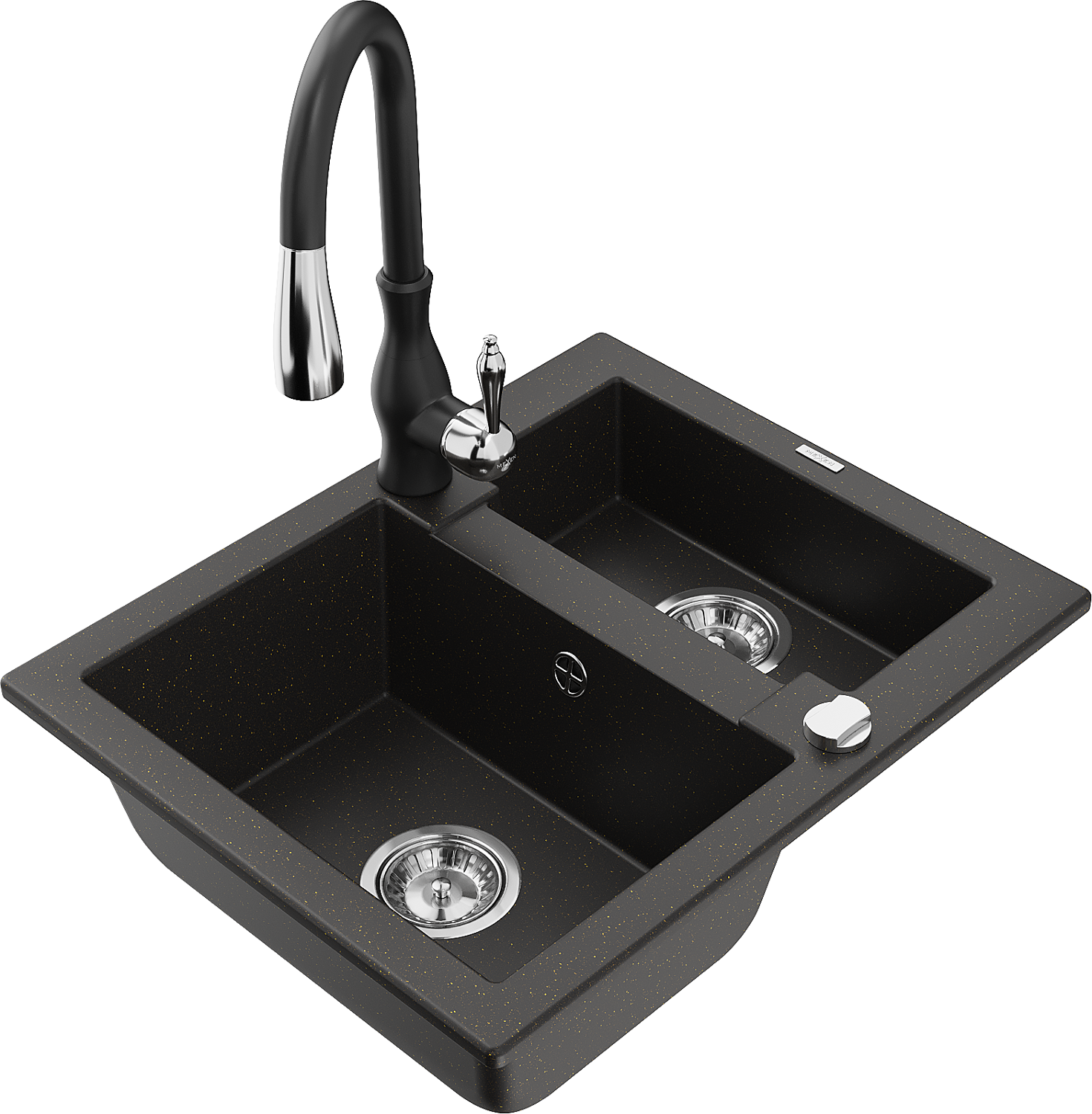 Mexen Carlos granieten spoelbak 1,5-komor met keukenmengkraan Savita, zwart/goud metallic - 6518-75-672601-70
