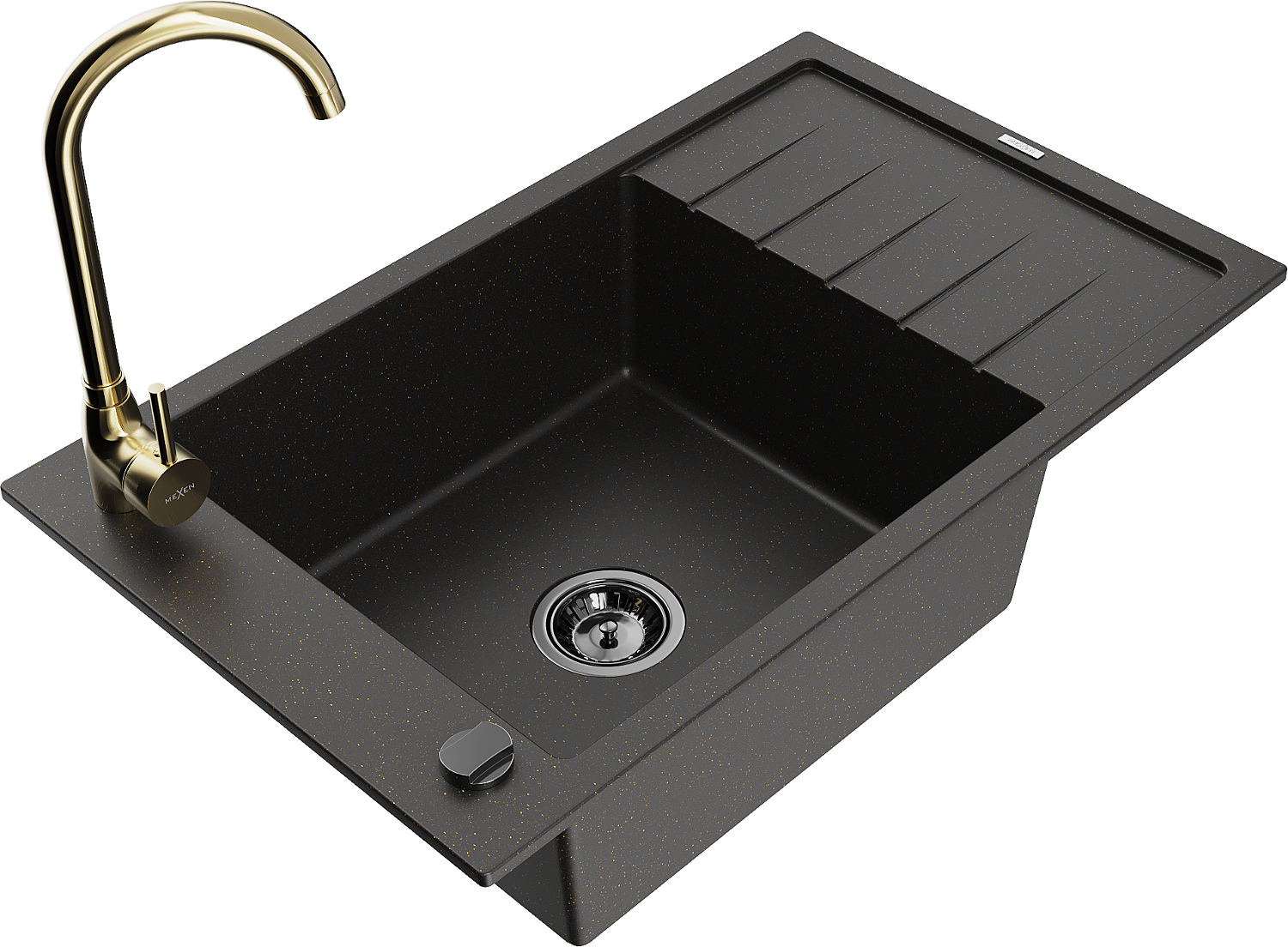 Mexen Elias granieten spoelbak 1-kommer met afdruiprek en keukenkraan Telma, zwart/goud - 6511-75-670200-50-B