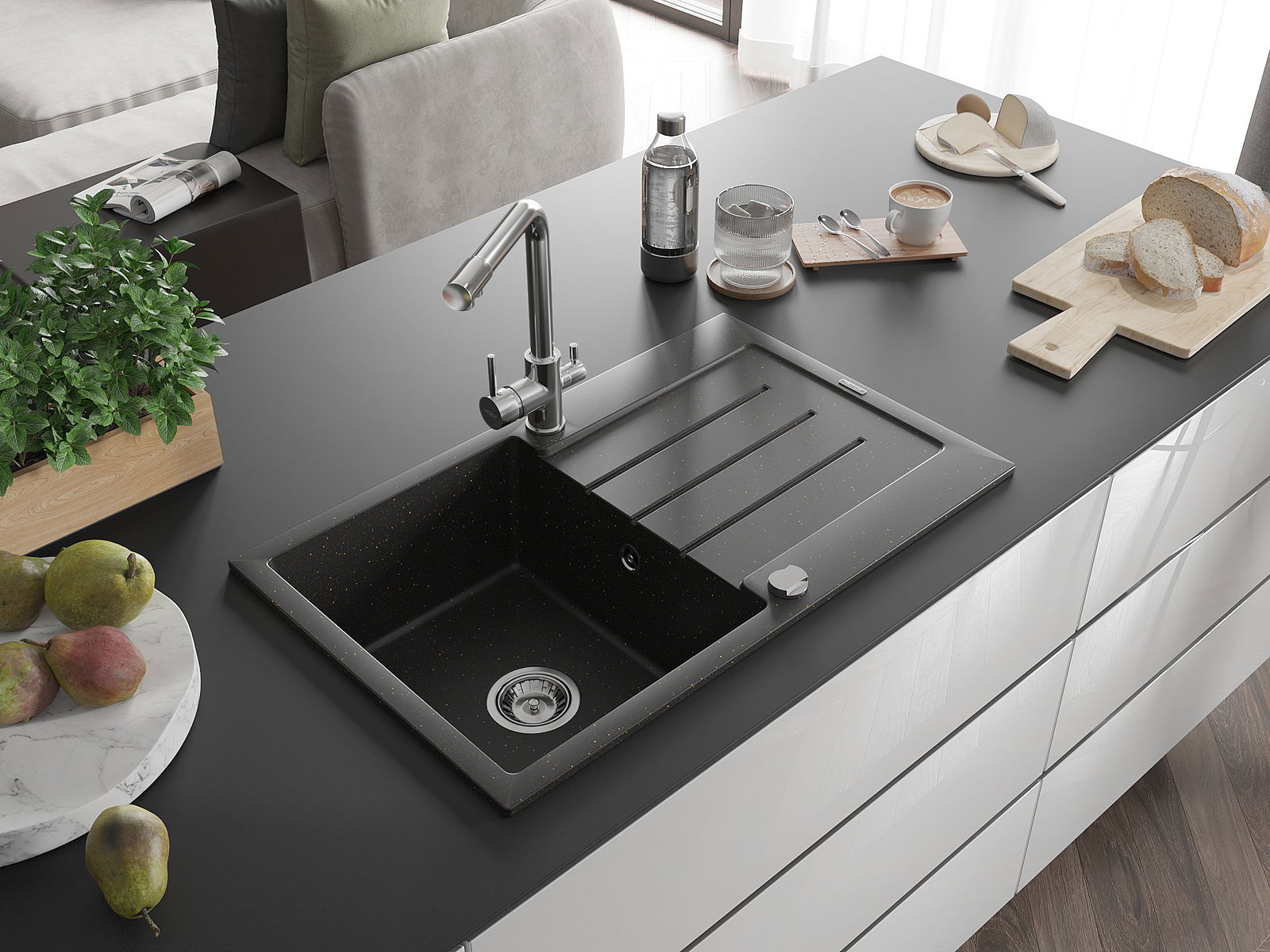 De gootsteen is gemaakt van hoogwaardig graniet. Het vormt een elegante en vooral praktische aanvulling op elke keuken, ongeacht de stijl. De hoge kwaliteit en duurzaamheid van graniet zorgen voor jarenlang gebruik.