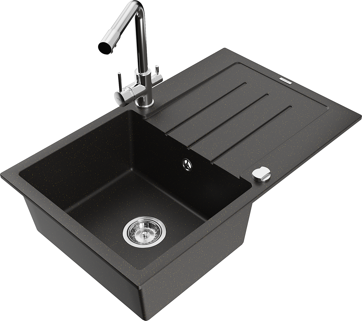 Mexen Bruno granieten spoelbak 1-kompartiment met afdruiprek en keukenmengkraan Duero, zwart/goud metallic - 6513-75-671600-00