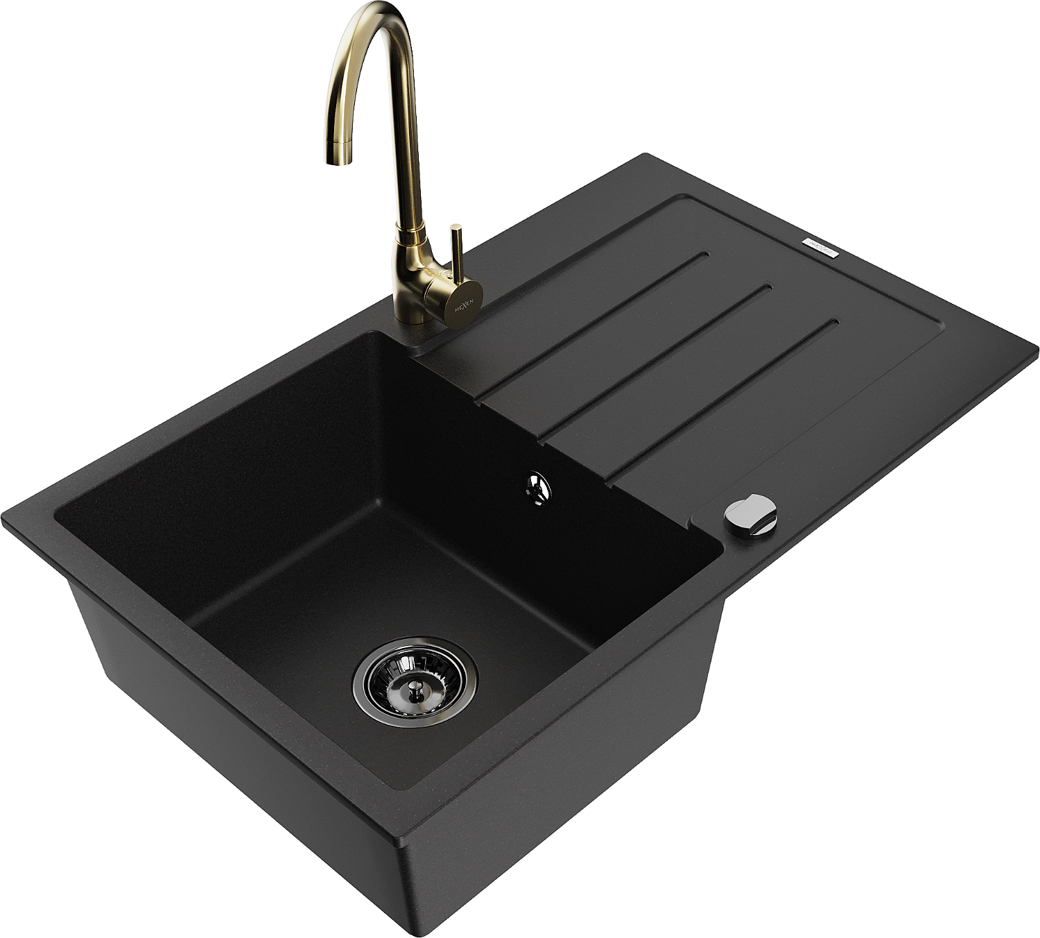 Mexen Bruno granieten spoelbak met 1 spoelbak, afdruiprek en keukenmengkraan Telma, zwart - 6513-77-670200-50-B